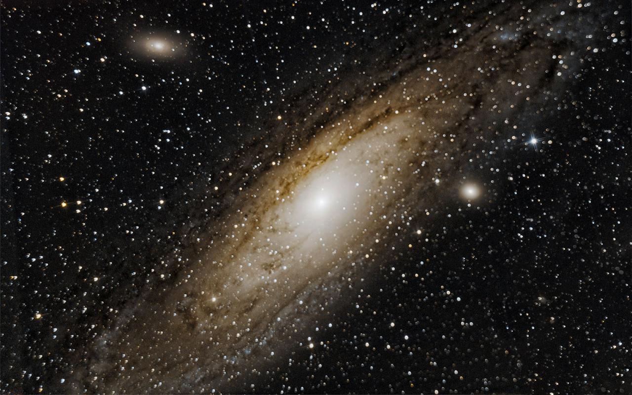2,5 Millionen Jahre, bis es bei uns ankommt. Wir sehen also die Andromeda-Galaxie, wie sie aussah, als sich gerade die Evolutionslinie der Menschenaffen von der Linie der heutigen Affen abspaltete, also Vorläufer des heutigen Menschen entwickelten. Wohlgemerkt Vorläufer. Wie die Andromeda-Galaxie zu Zeiten z.B. des Neandertalers aussah, wissen wir noch nicht. Das Licht ist noch nicht hier bzw. zu langsam.