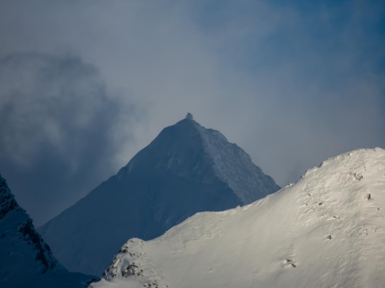 Der Hochfeiler dick verschneit und vor allem voller Raureif, das Gipfelkreuz sieht mehr wie ein sitzender Drache aus:
