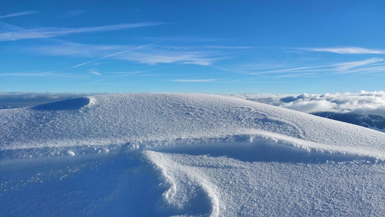 Viel Nebel, Wind und immer wieder (etwas) Neuschnee, teils bis etwa 2.600m herunter. Mit der Neuschneeauflage bildeten sich tolle Kontraste heraus: Leuchtendes Weiß vs. rot-braun gefärbeter Altschnee (Saharastaub).