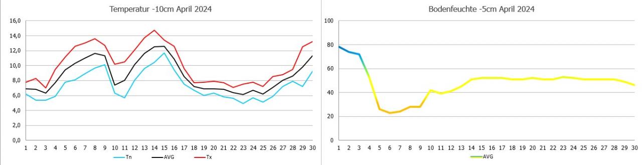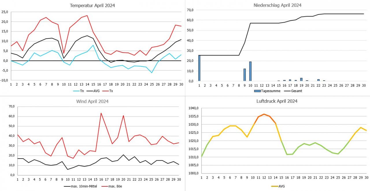 Ab der Monatsmitte kam es dann nochmal zu einer ausgeprägten knapp zweiwöchigen Troglage wo wiederholt Schneefälle bis teils auf 700m in Südtirol (anderswo in den Alpen auch deutlich tiefer) fielen. Durch den Nordföhn wurden höhere Niederschläge vermieden, aber vor allem kräftige Schneegraupelschauer schafften es regelmäßig mit vorübergehenden anweißen über den Hauptkamm ins Pfitschertal. Wie erwähnt war auch der Wind durch den Nordföhn in dieser Wetterlage fast omnipräsent, teilweise auch recht kräftig mit stürmischen Böen. In freien und prädestinierten Lagen wird vermutlich auch eine Sturmböe dabei gewesen sein. Am Ende der Lage gab es mit einschlafen des Nordföhns teilweise Luftfrost bis auf rund 500m und hier im Tal nochmals mäßigen Frost. Bodenfrost wird bis an die tiefsten Stellen Südtirols (um 220m) ein Thema gewesen sein, sehr zum Ärger der Bauern, die mit Frostberegnung versuchten Schäden zu vermeiden, dass meines Wissens nach aber zumindest hier in Südtirol meist geglückt ist. Erst die letzten Apriltage erholten sich wieder auf Normalniveau bzw. landete der letzte Tag auch wieder ein gutes Stück darüber.