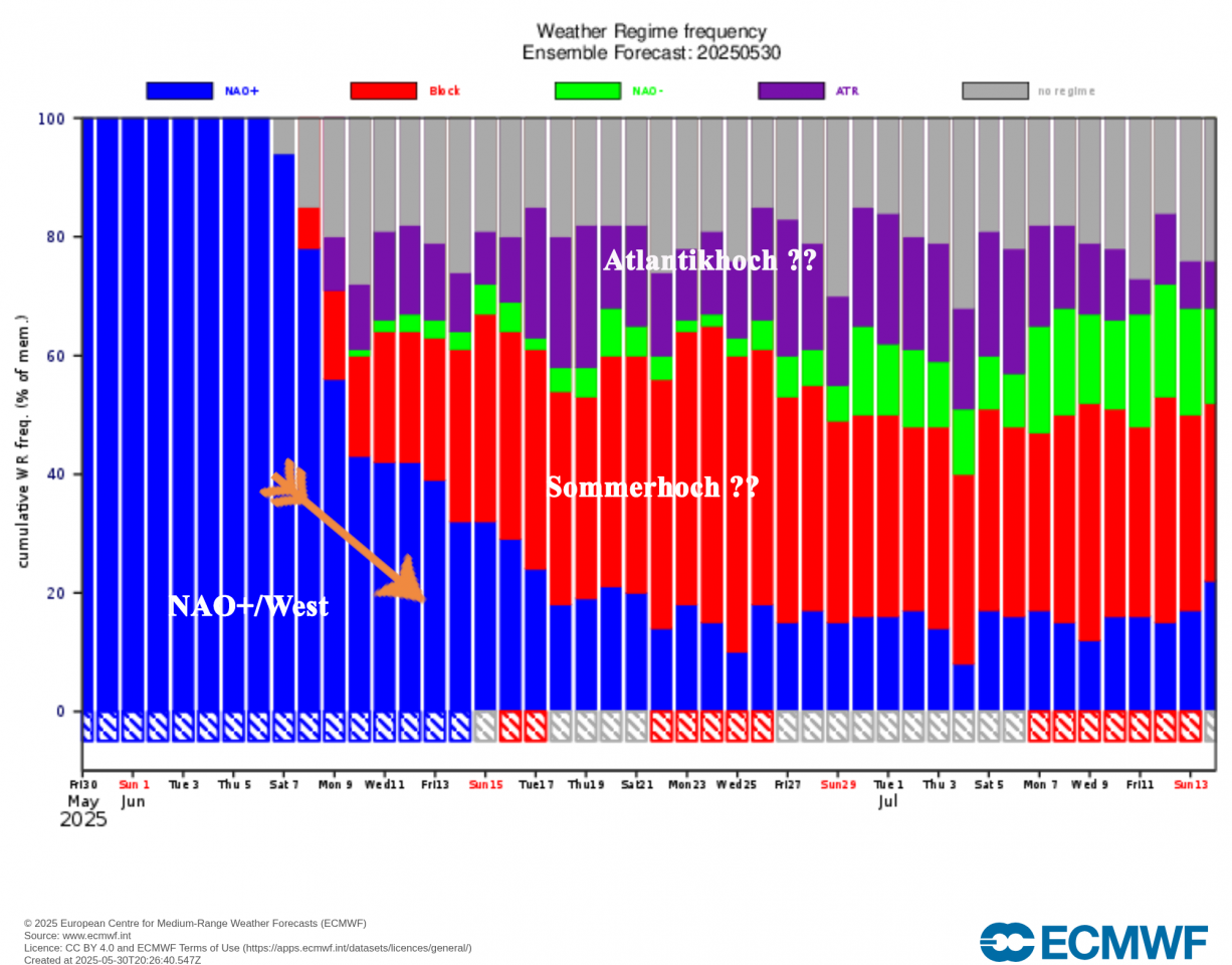 Wohl wird für längere Zeit so bis Mitte Juni dann das Islandtief prägend sein beim Wetter - also viel Konvektion (Schauer Gewitter) Große Unterschiede beim Niederschlag zwischen viel und teilweise nichts. Ein Übergang vom blau auf Rot, würde ein Blocking wahrscheinlich von einem ausgeprägten Hoch über Mitteleuropa im weiteren Verlauf bedeuten. Ob sich das bestätigt, muss man abwarten. Es kann sein, dass uns die Westwetterlage bis Juli beschäftigen wird. Aber bis zum Juli kann sich noch viel ändern.