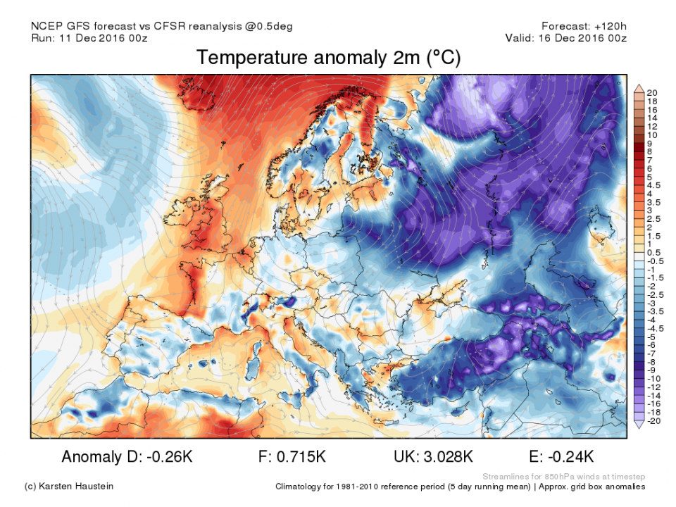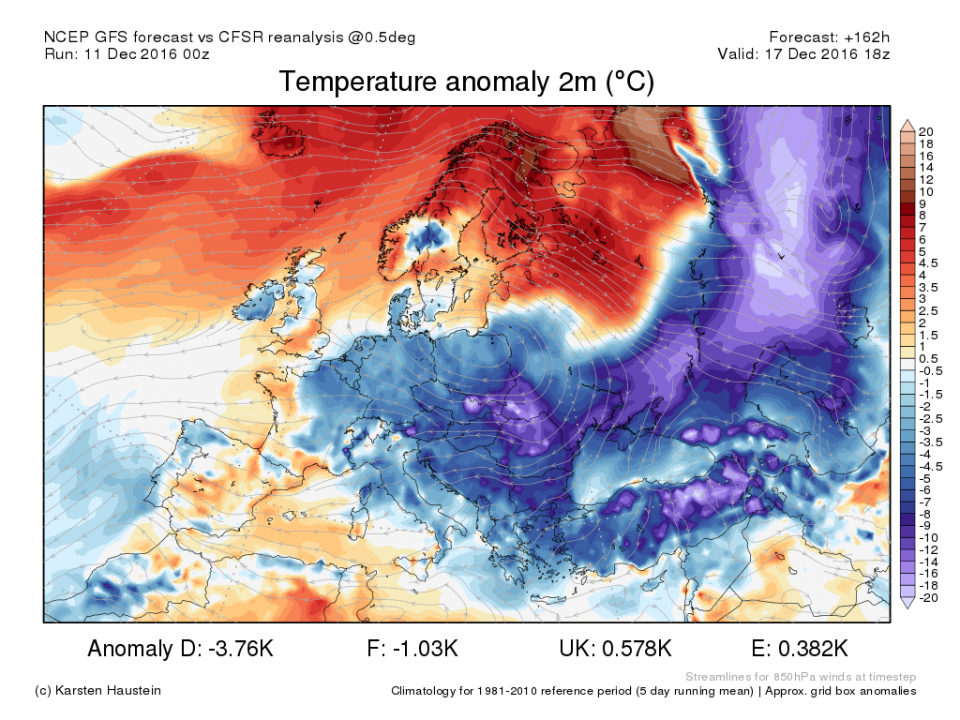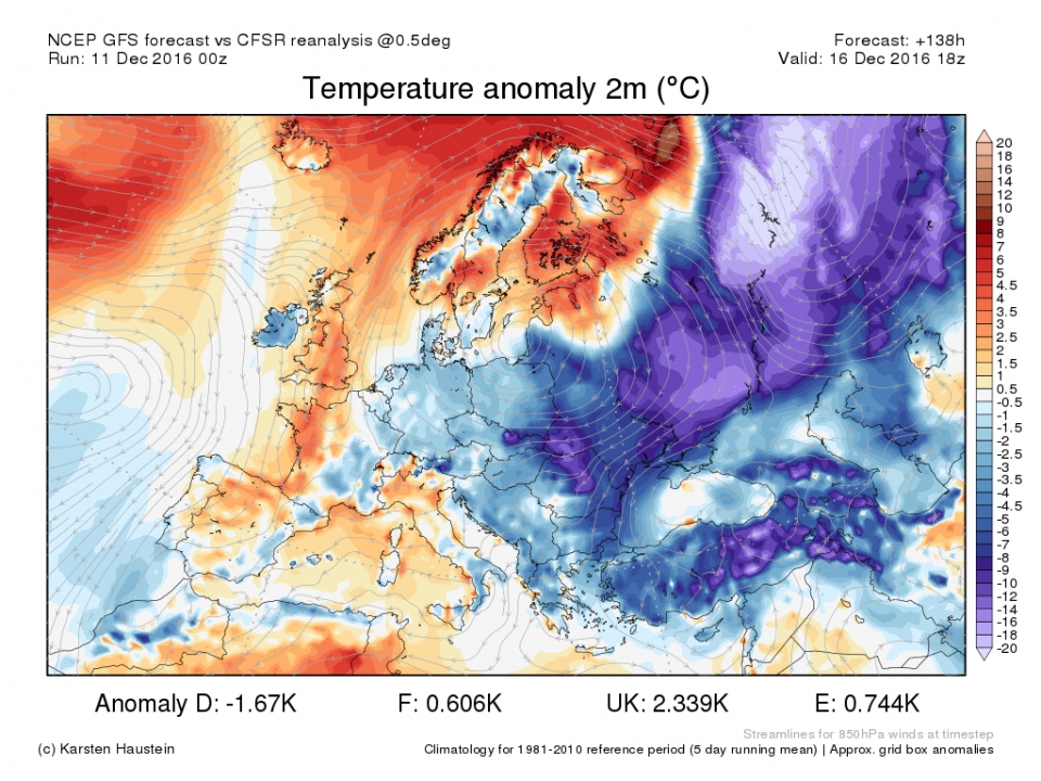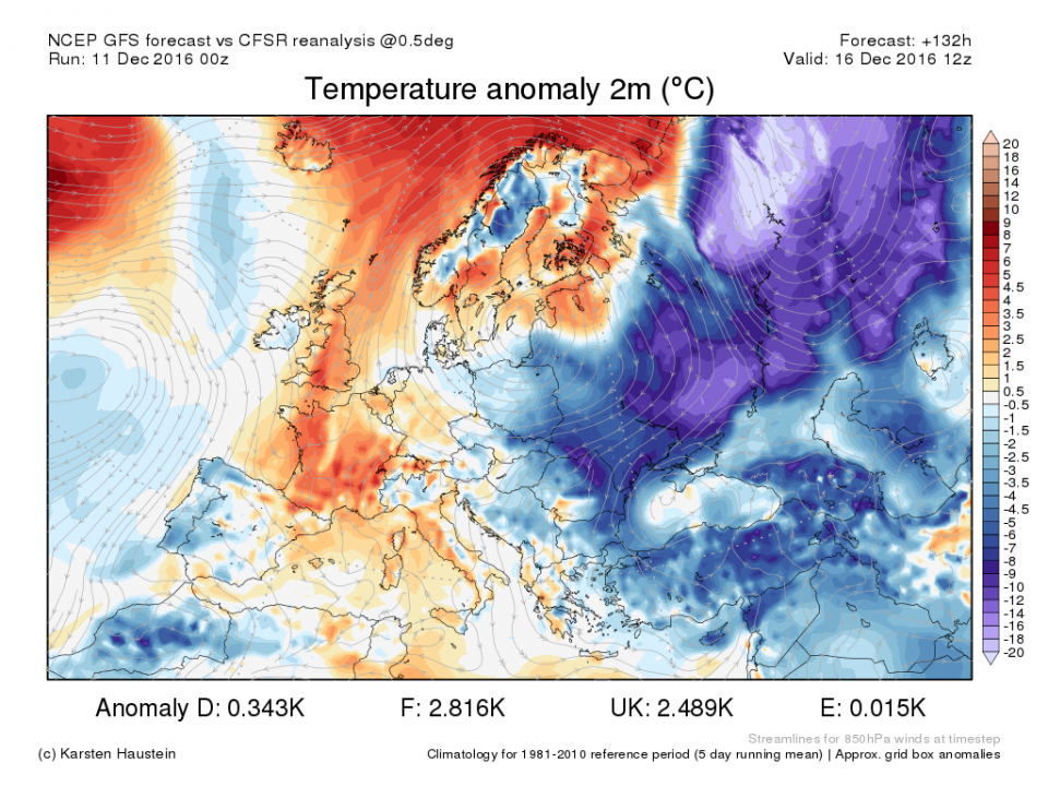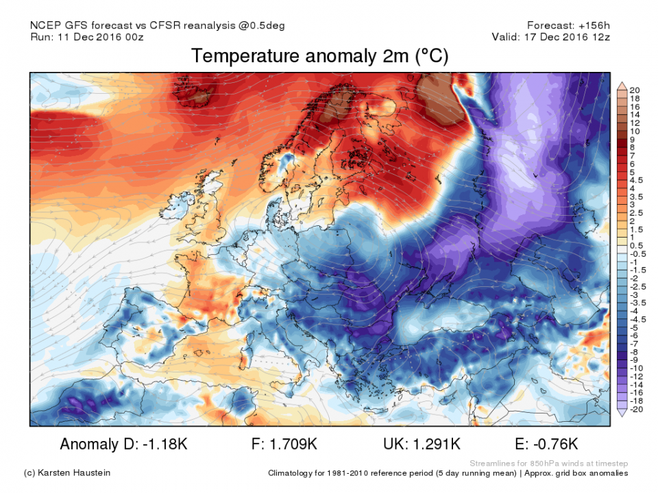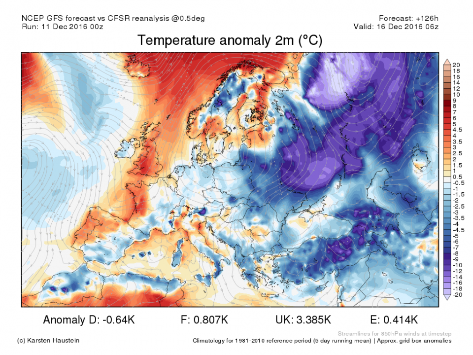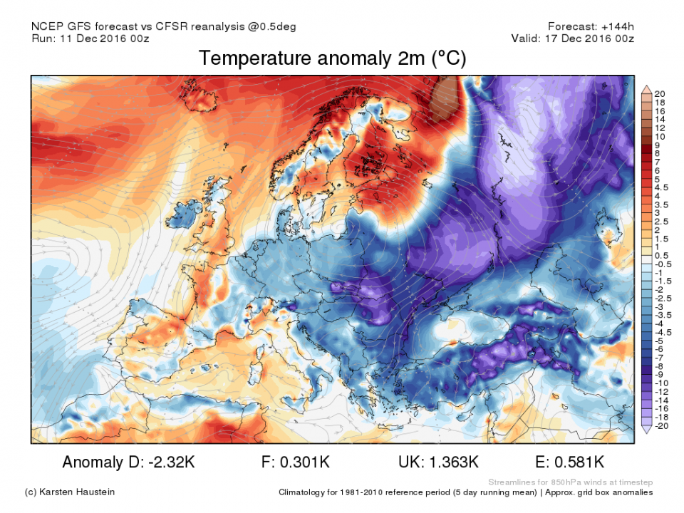 Das Modell bleibt seinen bodennah gerechneten kalten Lösungen treu und rechnet ab 15. Dezember den Übergang zum Dauerfrost, in Form mehrerer Eistage.