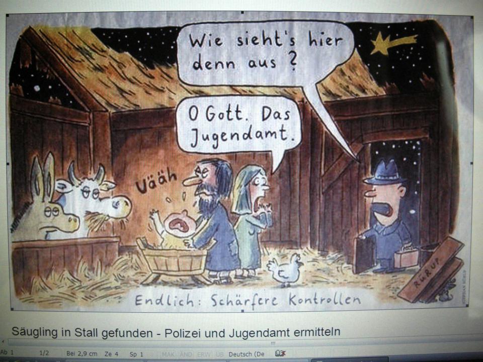 In den frühen Morgenstunden wurden die Behörden von einem besorgten Bürger alarmiert. Er hatte eine junge Familie entdeckt, die in einem Stall haust. Bei Ankunft fanden die Beamten des Sozialdienstes, die durch Polizeibeamte unterstützt wurden, einen Säugling, der von seiner erst 14-jährigen Mutter, einer gewissen Maria H. aus Nazareth, in Stoffstreifen gewickelt in eine Futterkrippe gelegt worden war.