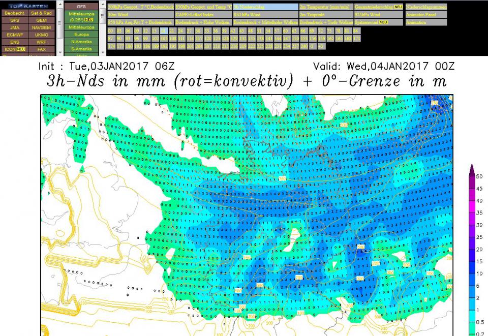Da sieht man für deine Gegend zum Zeitpunkt dieses "3 cm Niederschlags" eine Temp von -2 bis -4 Grad! (Erkennt man