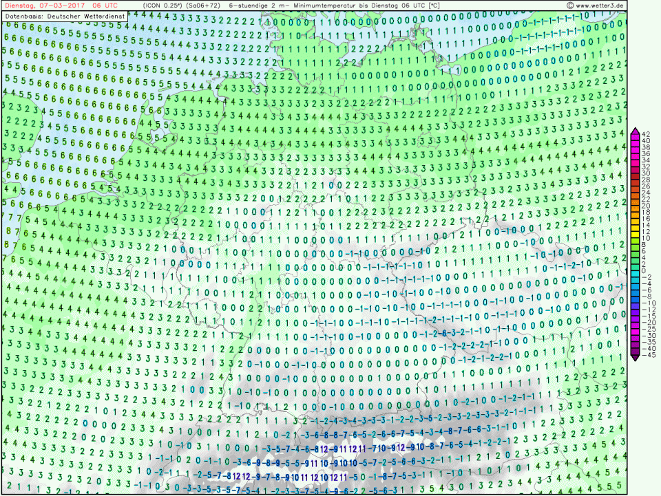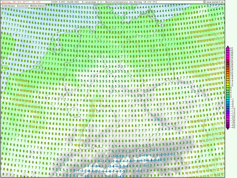 ... und Montag meist keine 10°C mehr, in den nördlichen Mittelgebirgen um 5°C: