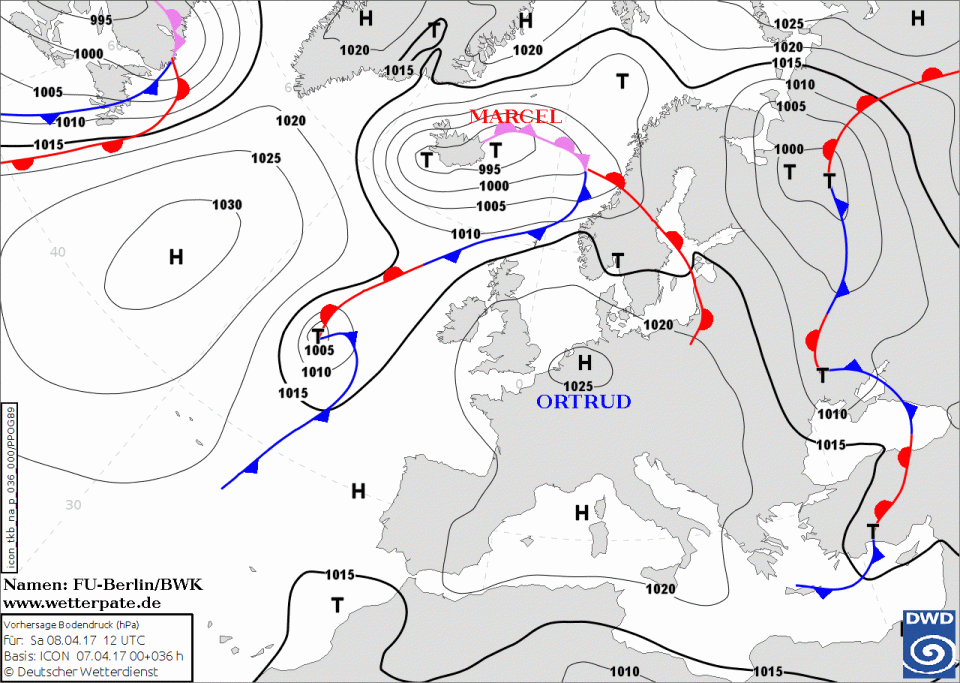 Grund hierfür ist die Verlagerung des Hochs "Ortrund" nach Osten. Aktuell befinden wir uns auf den Ostflanke dieses Hochs (also in einer eher nördlichen Höhenströmung), bis zum Wochenende aber auf die Westflanke. In Kombination mit einem Langwellentrog der sich von Nordwesten nähert kommt eine südwestliche Höhenströmung in Gang mit der deutlich mildere Luftmassen herangeführt werden.
