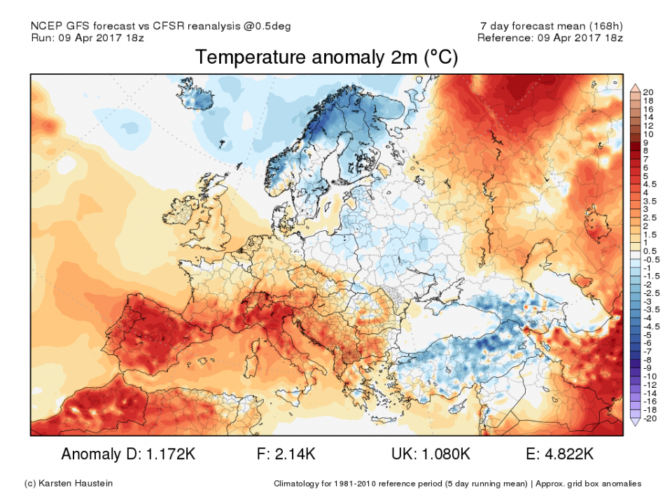 Grund ist einerseits der schon sehr warme Süden. Man beachte Spanien diese Woche, wo Sommer pur herrsche… und dazu der Gegensatz im Norden Europas.