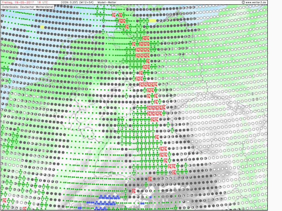Entlang der Konvergenz soll es zumindest ICON (das Modell vom DWD) zufolge verbreitet zu Gewittern am späten Nachmittag kommen: