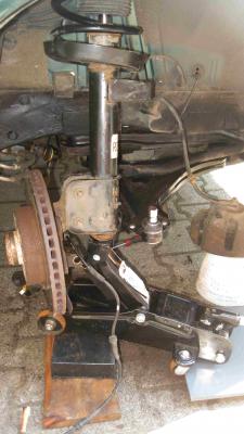 Nun war der Weg frei um unter dem Einsatz der Federspanner das Domlager des Federbeins zu wechseln. Ging ruckzuck. Hier nun das ausgebaute komplette Federbein mit Achsschenkel und Bremse.