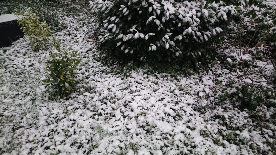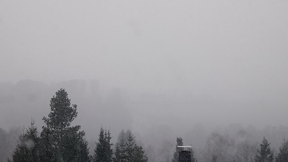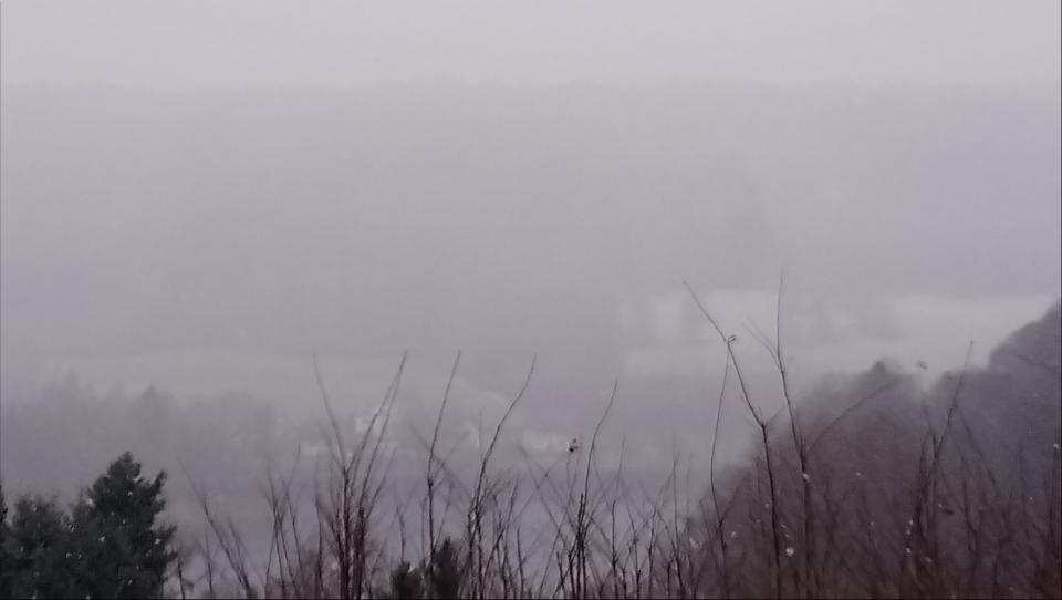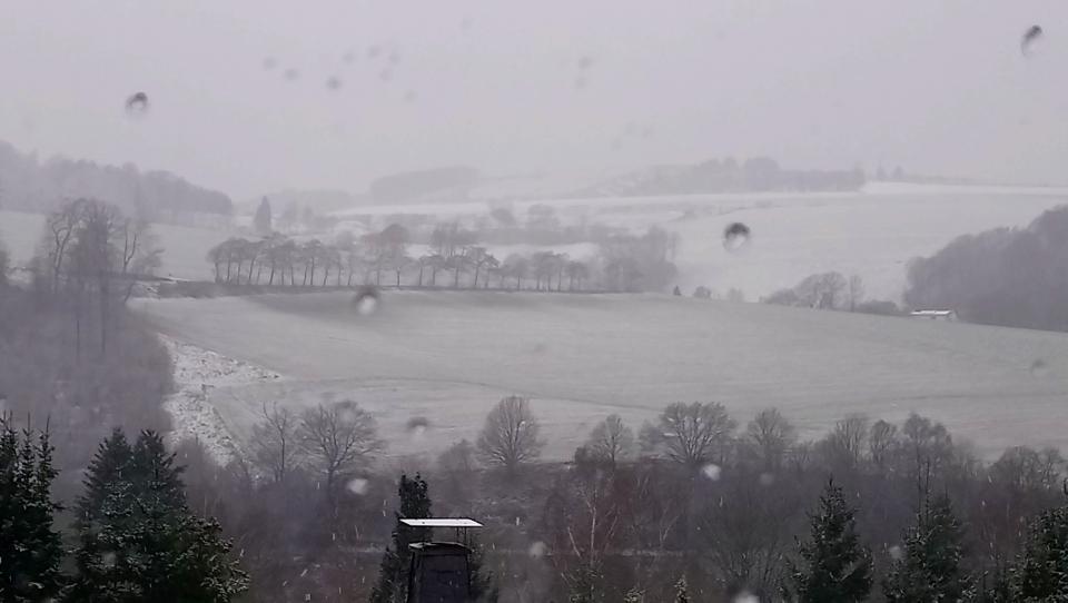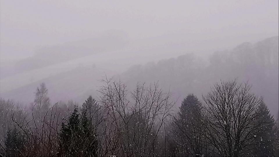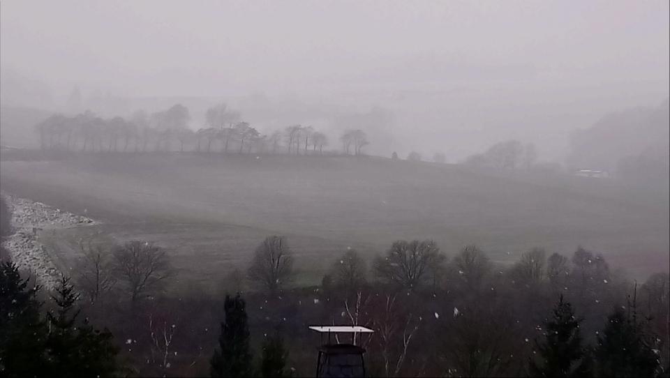 Takt 0,8°C, mäßiger Schneefall, die Schauer stauen sich hier zum langanhaltenden Schneefall. Je nach Untergrund Schneereste oder durchbrochene Schneedecke von 2cm.
