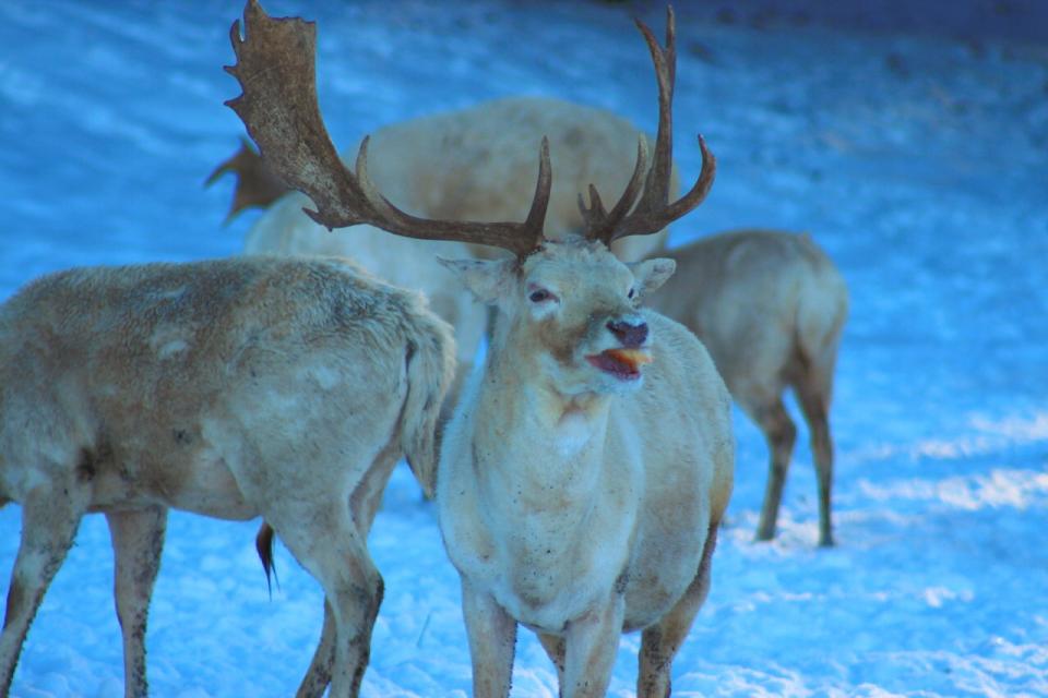 Kam gerade dazu, als die dort im Wald gefüttert worden sind. Die einen haben Fleisch gegessen, das andere könnte was essen, das wie eine Kartoffel oder Äpfel aussieht.
