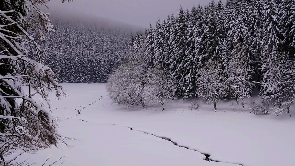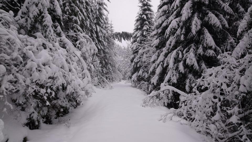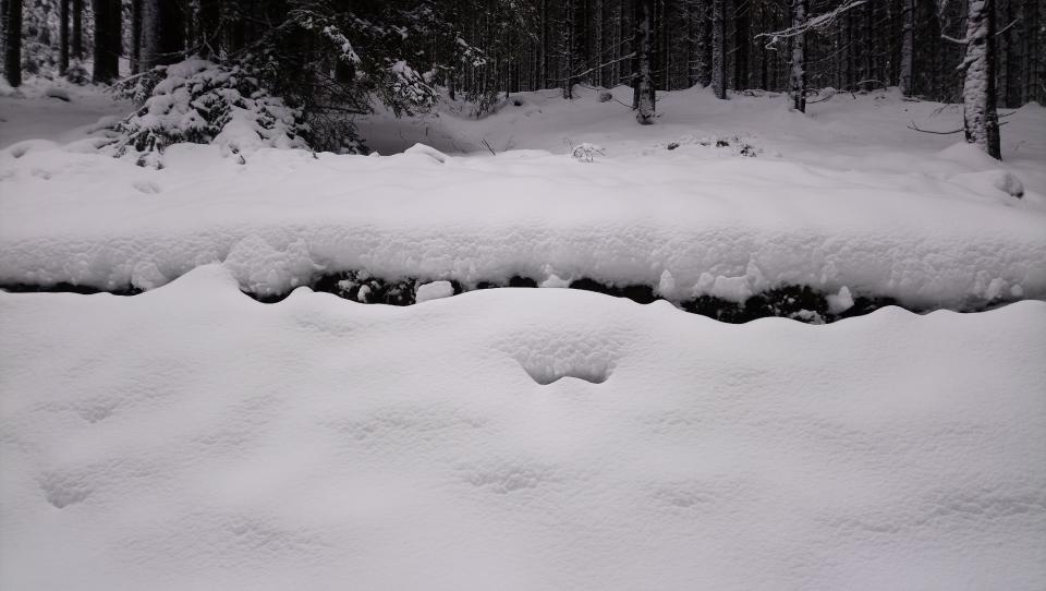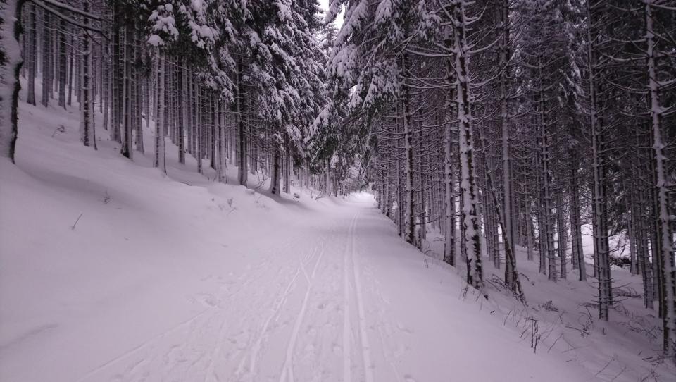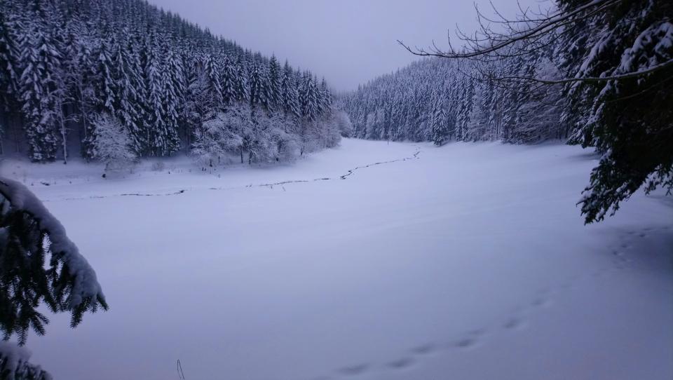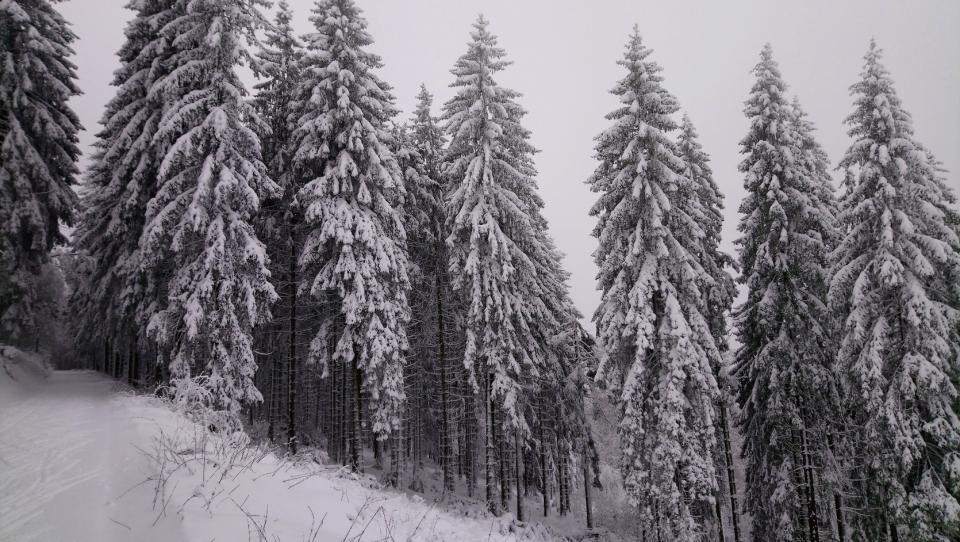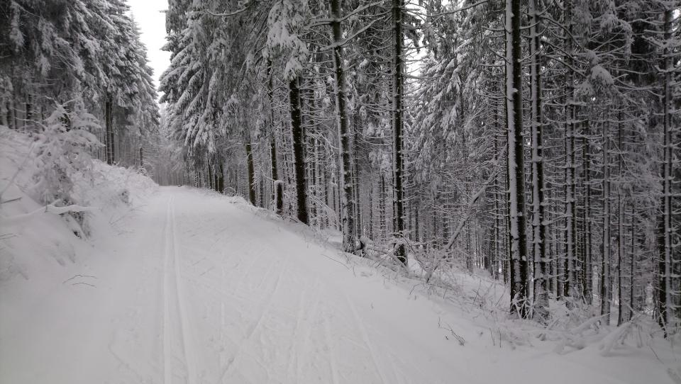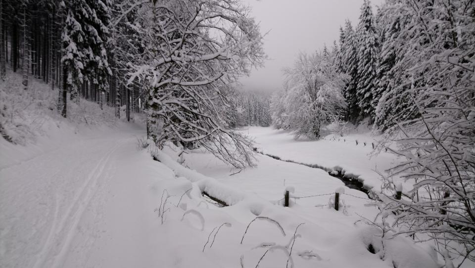 Hi, ich war heute skilanglaufen im Gebiet östlich von Westfeld im Lennetal. Das ist in diesem oberen Bereich ziemlich eng, sodass im Winter kein Sonnenstrahl da runter kommt. Und in so enge Täler kommt Wind schwerlich rein, sodass der Schnee kaum von den Bäumen geweht werden kann.