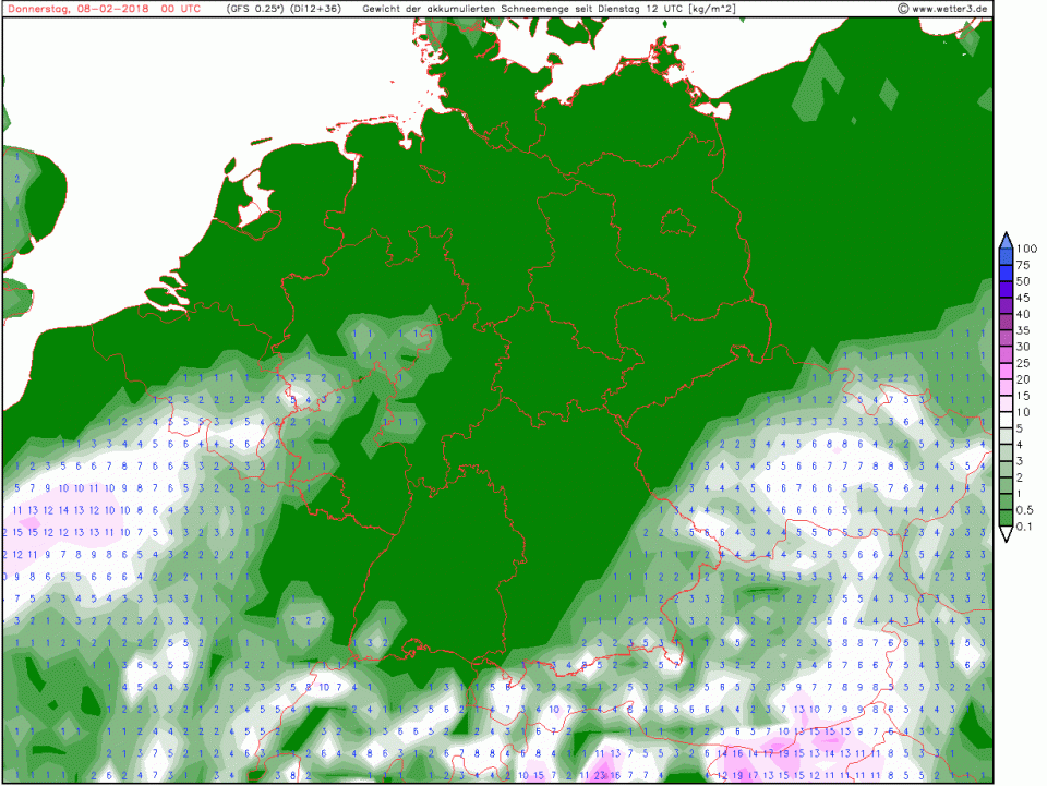 Verlauf des Donnerstags wieder abklingen. Sie bringen in tiefen Lagen insgesamt etwa 1 bis 5 cm Neuschnee, in den Alpen in Staulagen örtlich 10 bis 15 cm. Link ist nur fuer registrierte User sichtbar. registrieren oder login.