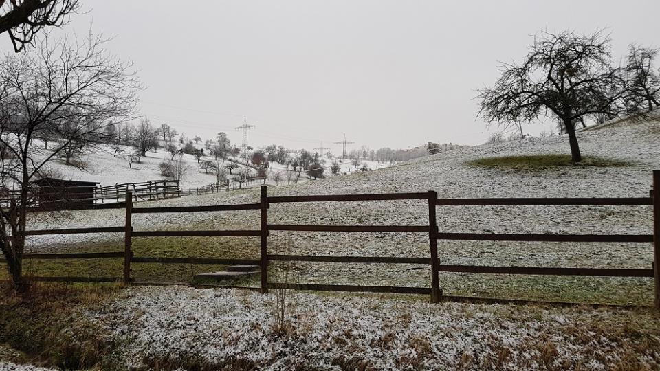 Der Schneefall begann gegen 10 Uhr, er blieb allerdings erst gegen 12 Uhr liegen. Die Intensität war von Anfang an mäßig und blieb den ganzen Tag gleich, aktuell (18:10 Uhr) schneit es immer noch. Hier die Werte: