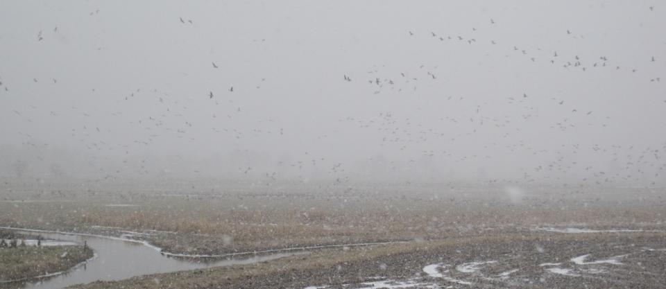 Südlich von Hamburg liegen stellenweise 7 bis 10 cm. Durch den frisch gefallenen Pulverschnee kann man im Fahrtwind des Zuges fast nicht raus schauen - herrlich! Jetzt wird es langsam weniger.