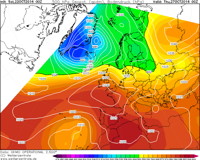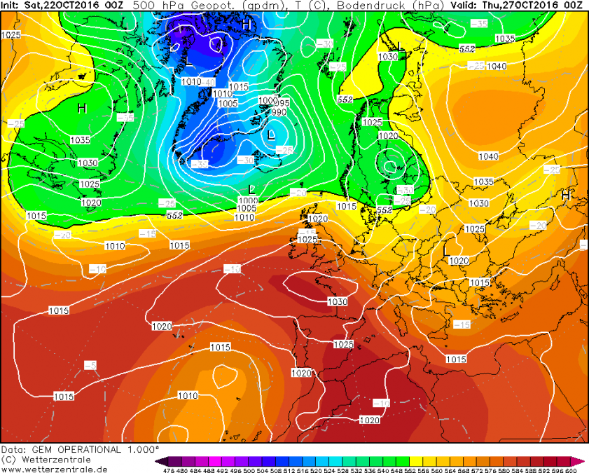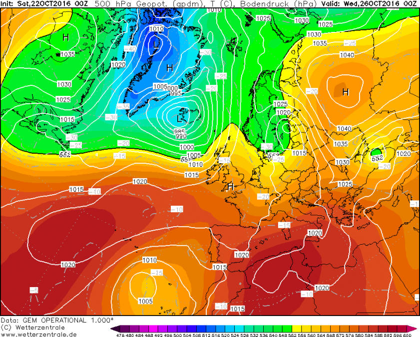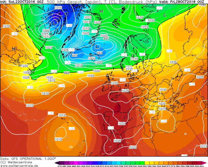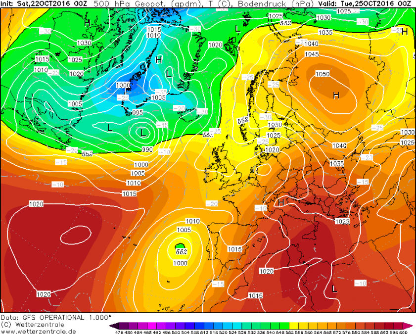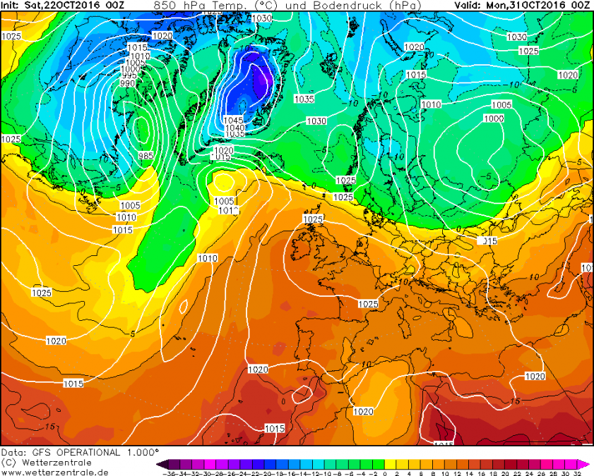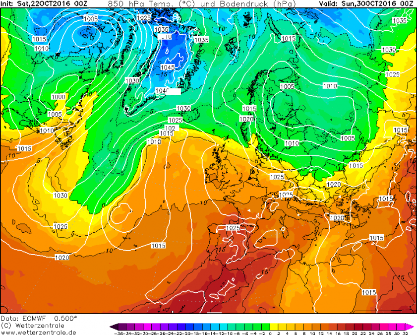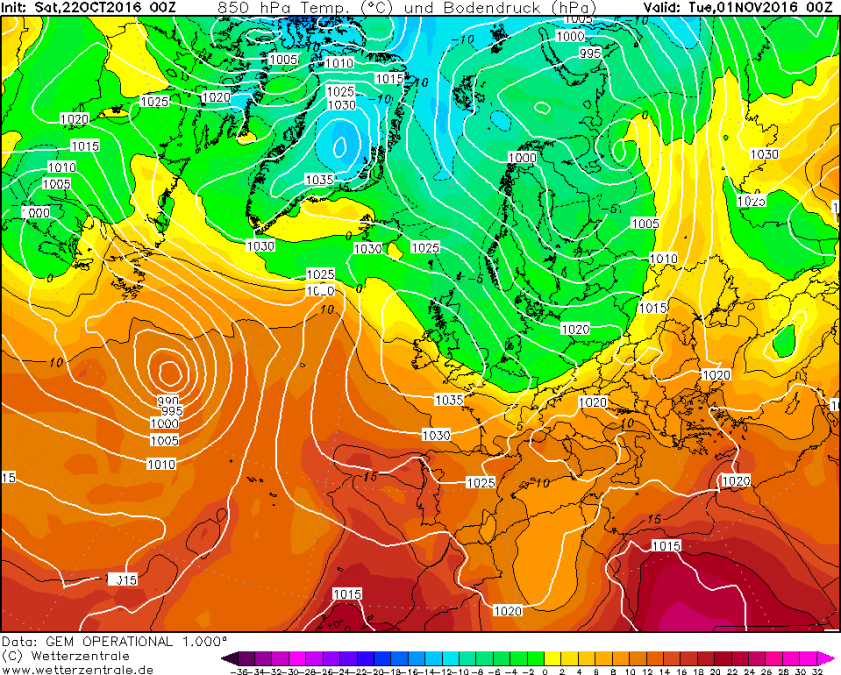 der Kaltlufttropfen ist in Kürze Geschichte, er wird von einem Trogvorstoß nach Portugal bis runter zu den Kanaren (!) eingefangen und auf seiner Südseite ziemlich warme Luft bis zu 20°C in Teilen Süddeutschlands advehiert. Das äußert sich in einer nordwärts voran kommenden LMG, aber die überquert fast ganz Deutschland und auch nördlich davon herrschen nurnoch durchschnittliche Luftmassen für Ende Oktober vor: