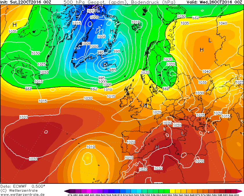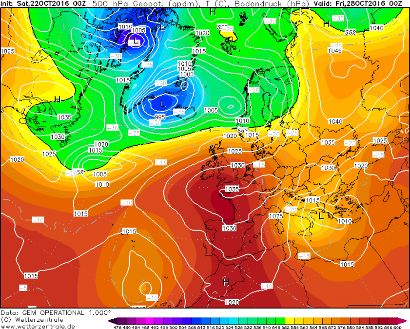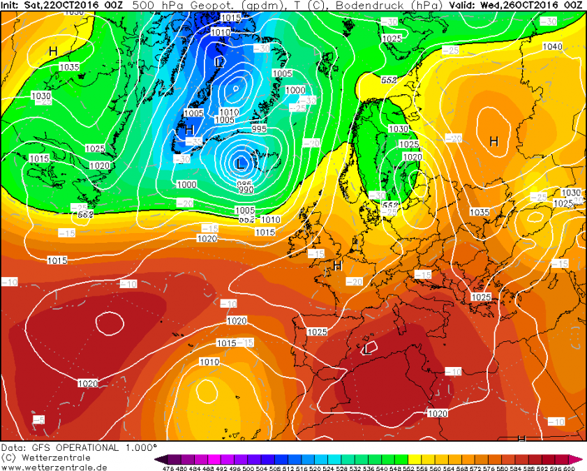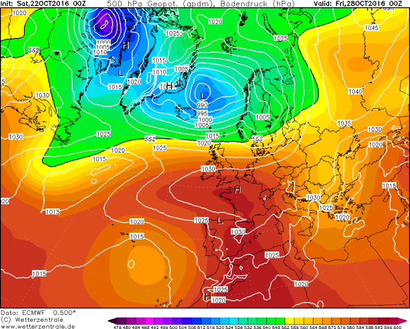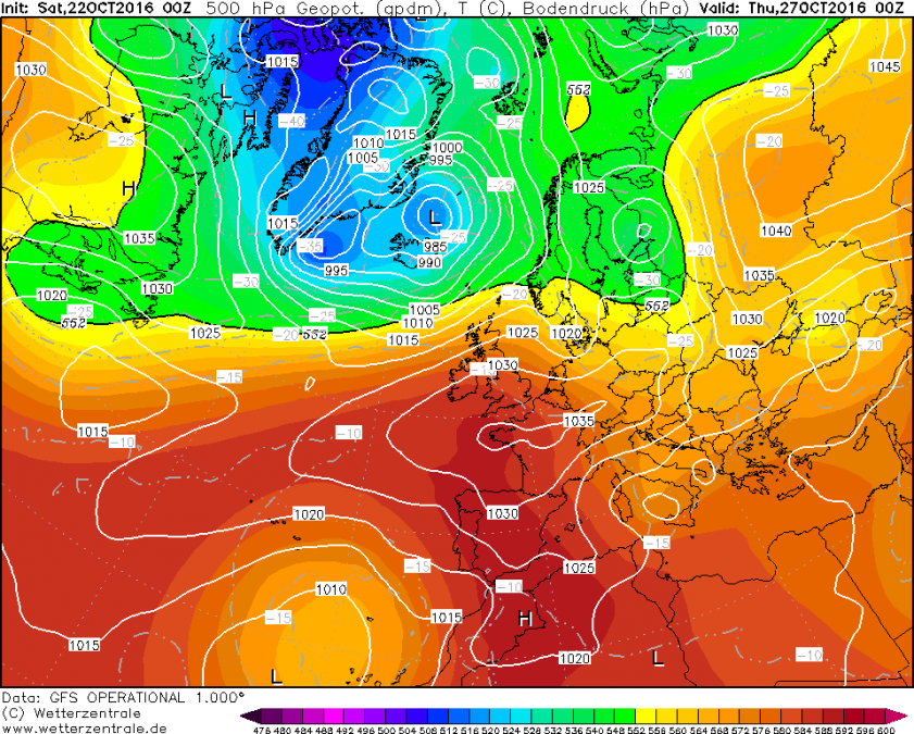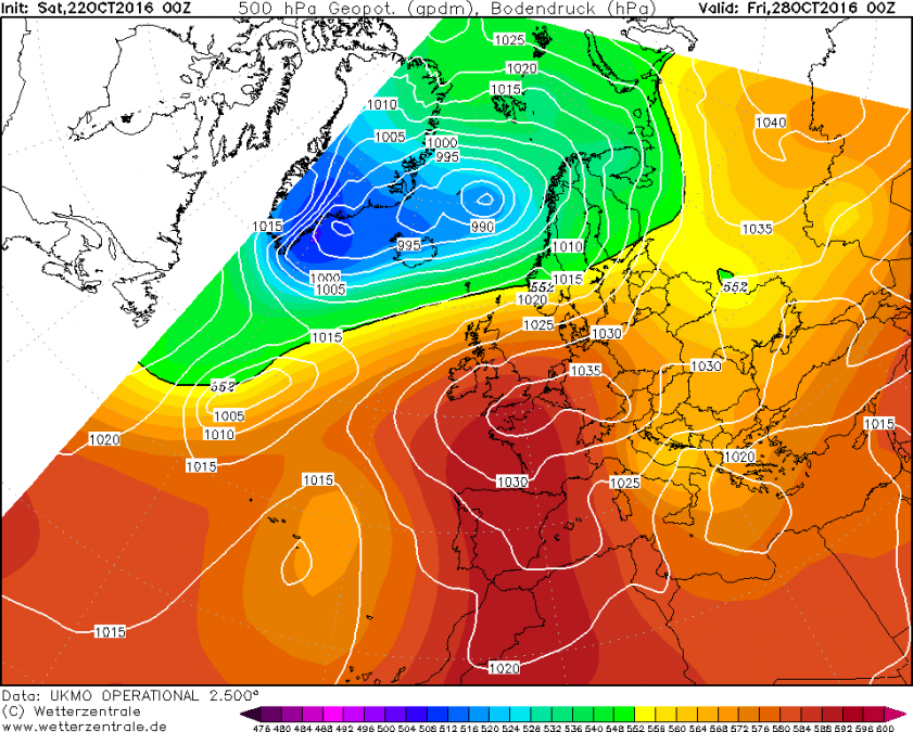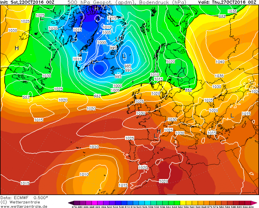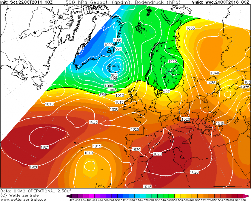 der Kaltlufttropfen ist in Kürze Geschichte, er wird von einem Trogvorstoß nach Portugal bis runter zu den Kanaren (!) eingefangen und auf seiner Südseite ziemlich warme Luft bis zu 20°C in Teilen Süddeutschlands advehiert. Das äußert sich in einer nordwärts voran kommenden LMG, aber die überquert fast ganz Deutschland und auch nördlich davon herrschen nurnoch durchschnittliche Luftmassen für Ende Oktober vor: