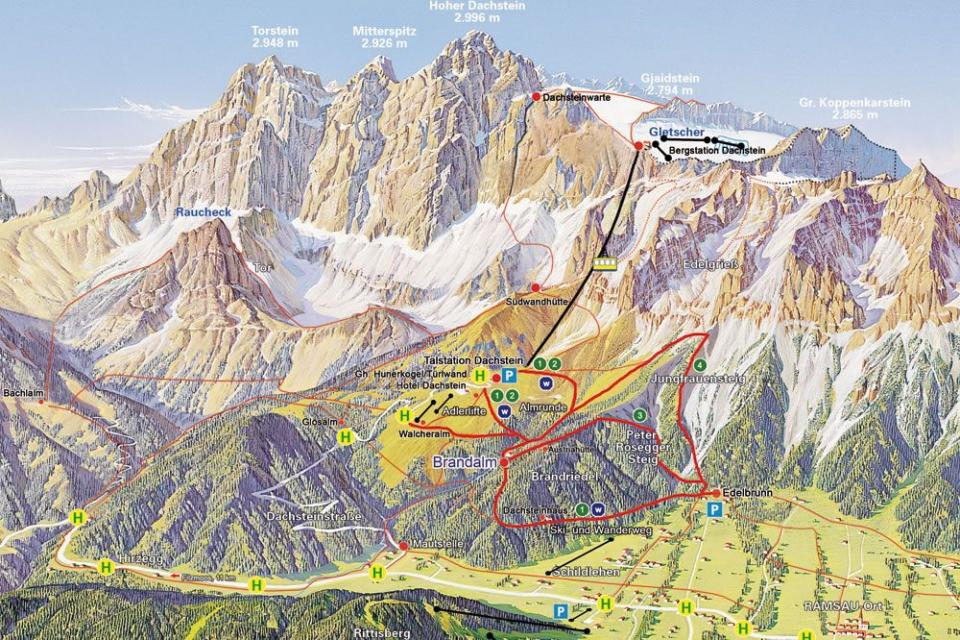 Talstation, welche auf den Gletscher raufführt. (sieh Grafik unten in der Nähe des "Parklatz Dachstein")