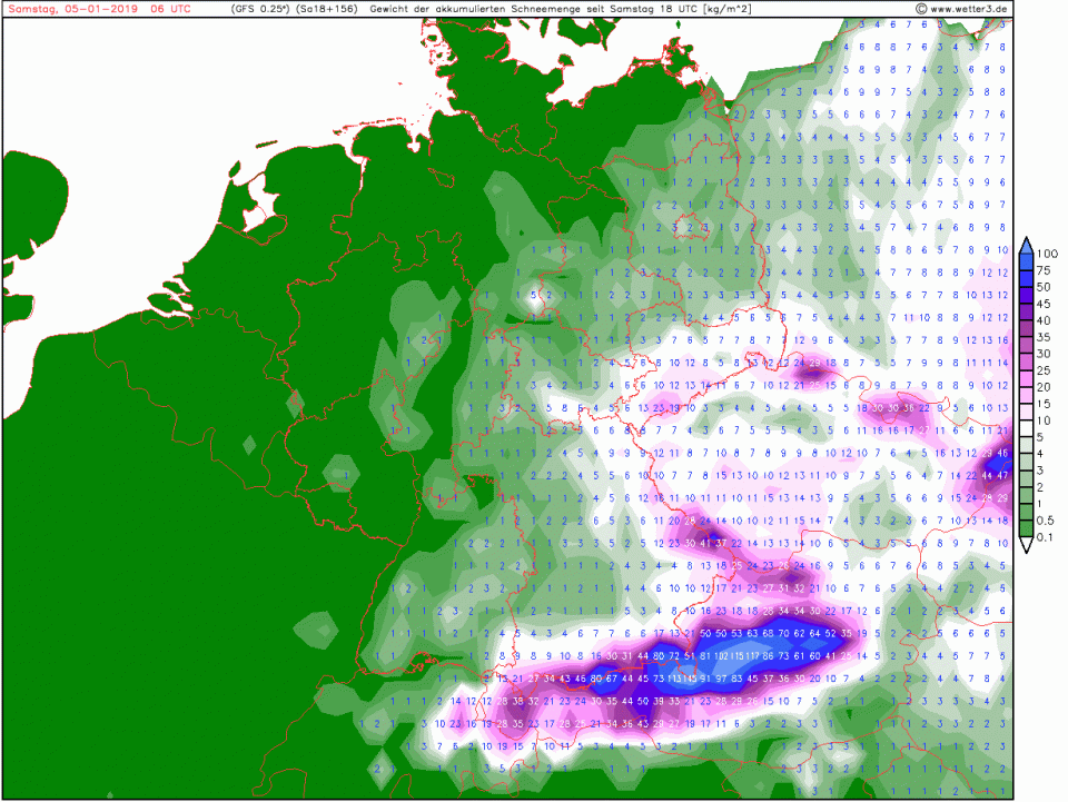 kann im Laufe der zweiten Nachthälfte noch etwas absinken (auf 300 bis 400 m). Im Thüringer Wald sowie in den ostbayerischen Mittelgebirgen fallen bis Sonntagfrüh oberhalb von 600 bis 800 m meist 5 bis 10 cm Neuschnee, in den Staulagen des Erzgebirges gebietsweise bis 15 cm, wobei in den Kammlagen der dort in Böen stürmische Nordwestwind für Verwehungen sorgen kann. An den Alpen setzen die Schneefälle erst später ein. Westlich des Inns kommen ebenfalls um oder etwas über 5 cm zusammen, nach Osten zu aber mehr, im Chiemgauund Berchtesgadener Land fallen bis zum frühen Vormittag bereits 5 bis 15 cm.
