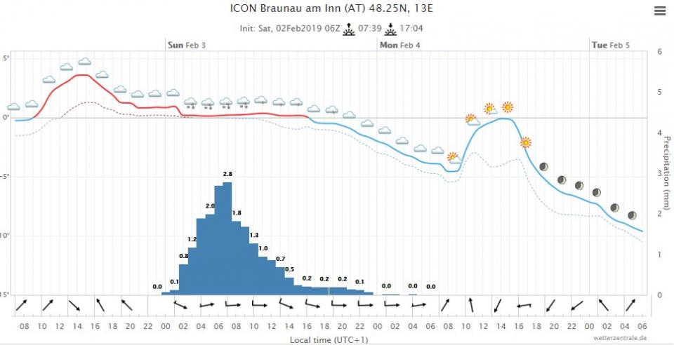 Über ME liegt heute noch ein Trog, der nasskaltes Wetter mit Schneenachschub in den zunehmend in kältere Luftmassen geratenden Nordalpen, Regen im noch milden O und langsamer Wetterberuhigung im S verursacht. Das Kontinentalhoch, das sich von NW-Russland bis in die Karasee erstreckt blockiert die weitere Progression des Troges, sodass er bis morgen Mo aber ins Mittelmeer abtropft und seinen Einfluss auf den Alpenraum verliert.