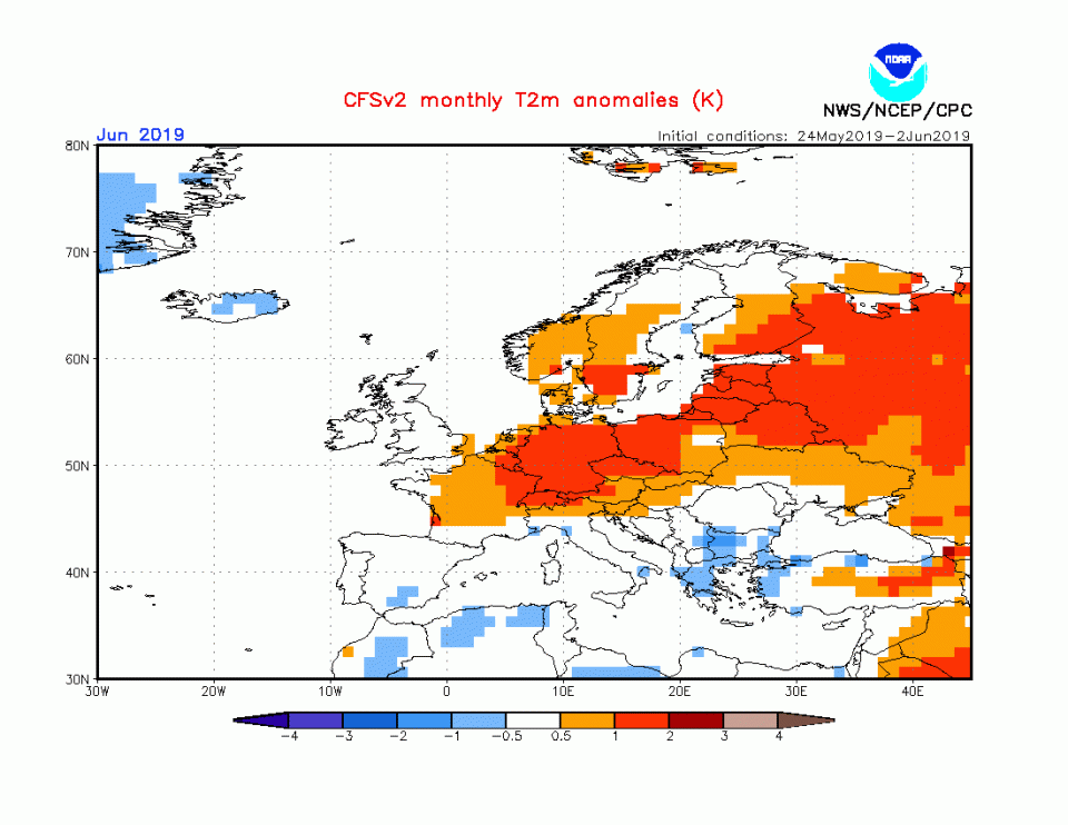 Vor ein paar Tagen, genau am 29.Mai.2019 hatte noaa einen Durchschnittswert von 0,5 - 1 ° zu warm gerechnet. Von gestern auf einmal mit 1 bis 2 ° zu warm.