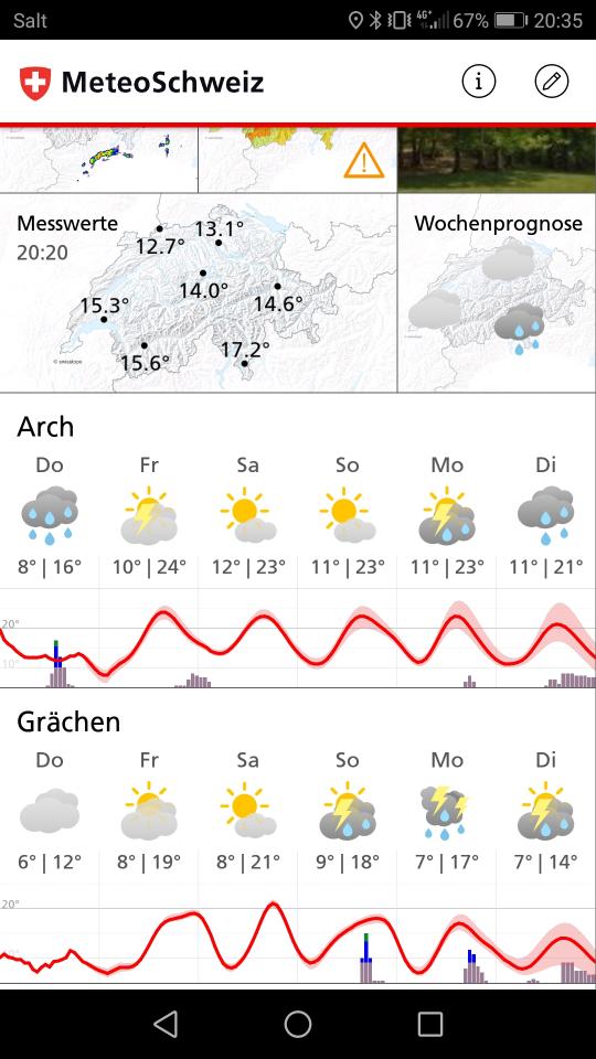 Zitat:Hinter einer Kaltfront bestimmt heute Donnerstag kühlere und mässig feuchte Luft das Wetter in der Schweiz. Allmählich baut sich ein kleinräumiges Zwischenhoch auf und bewirkt damit eine zögerliche Abtrocknung der Luft. Heute Donnerstag oft bewölkt und gebietsweise etwas Regen, vor allem gegen Westen hin.https://www.meteoschweiz.