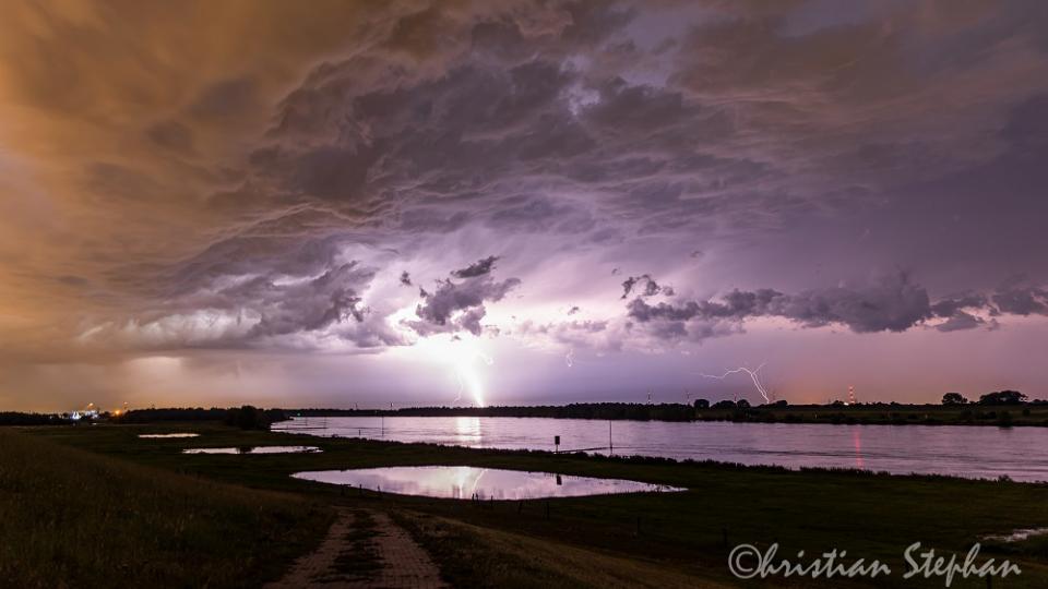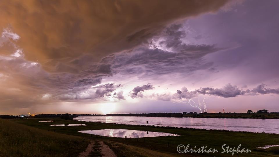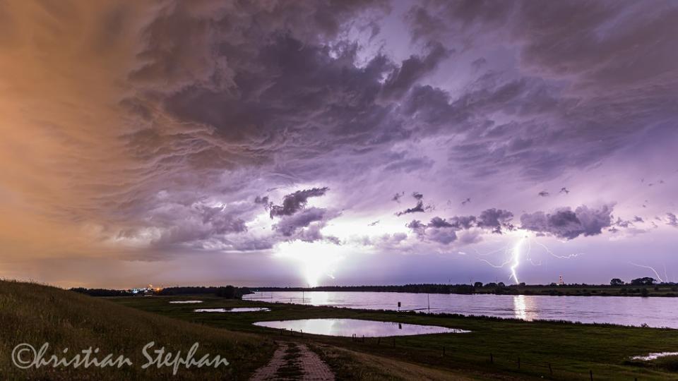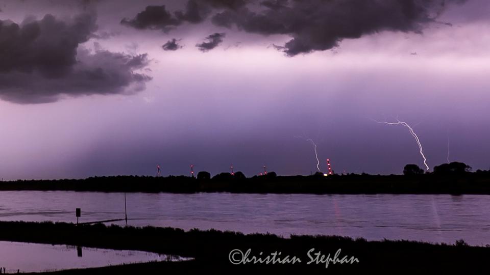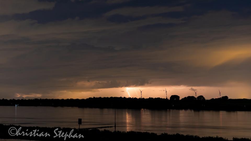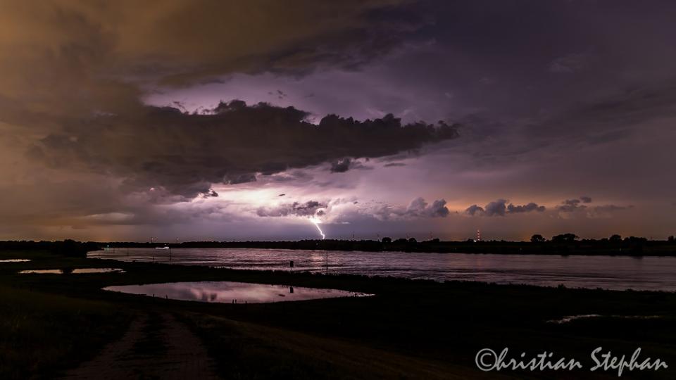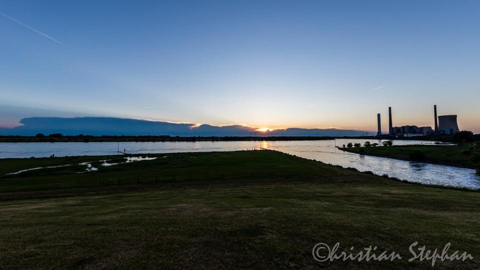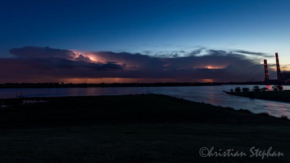Man bedenke, in unserer Gegend sind es nur wenige Kilometer (etwa 5) bis zur Grenze des Ruhrpottes, in unserem Fall Stadt Duisburg. Die dort ansässige Schwerindustrie sorgt in der Regel, gerade im Sommer, für genügend Dunst um vernünftige Fotos zu verhindern. Und wenn diese es nicht tut, dann die allermeisten Wetterlagen höchst selbst. Allein stehende Gewitterzellen bis in die Abendstunden sind bei uns aber sowas von selten, kann ich mich die letzten Jahre nicht dran erinnern sowas schon gesehen zu haben: