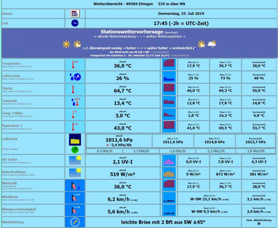 Takt: 32,1 °C (noch heißer als vor 24 Std zur gleichen Zeit) Tmin: 17,9 °C (keine Tropennacht erzielt worden)