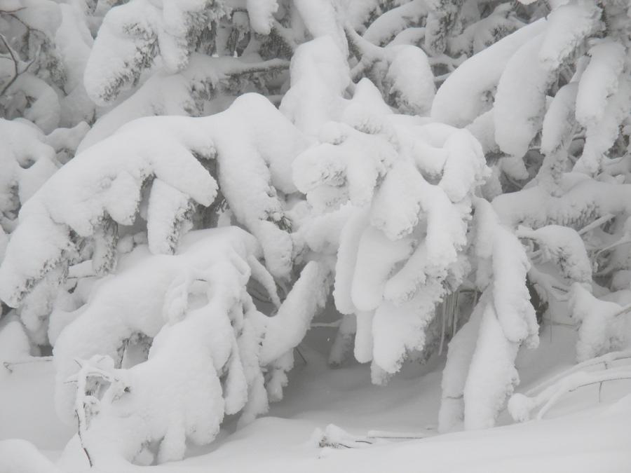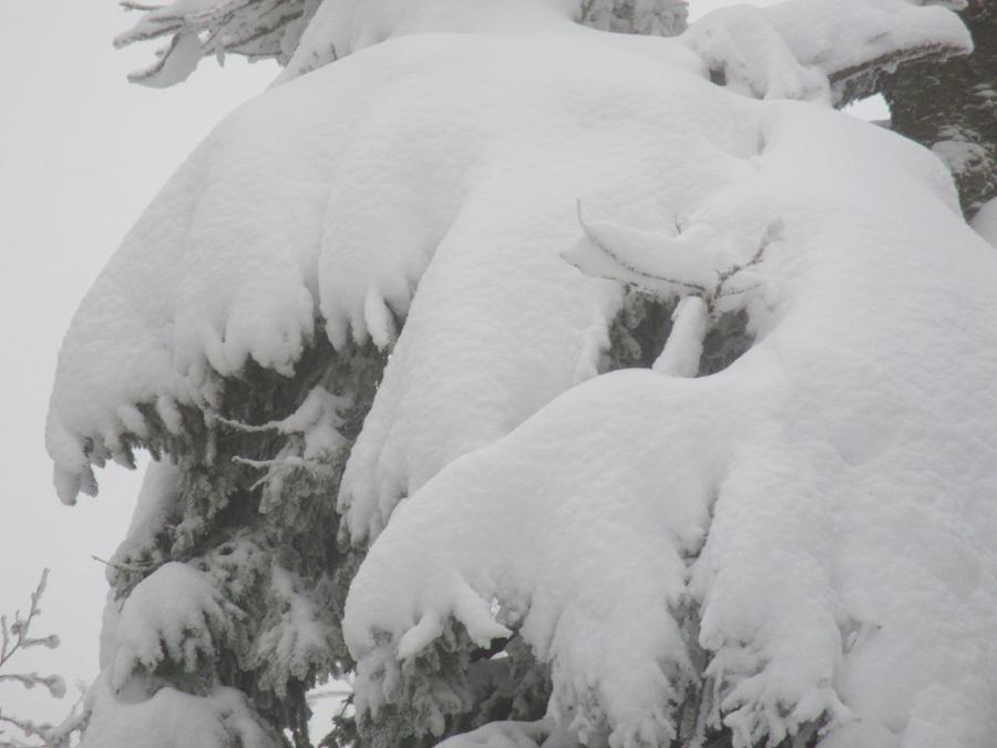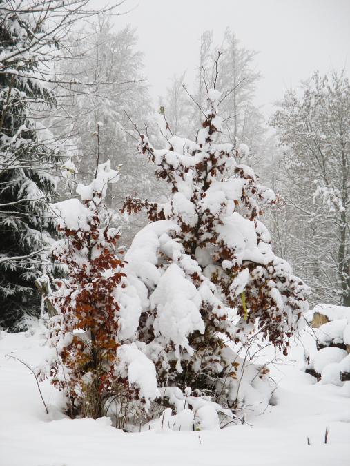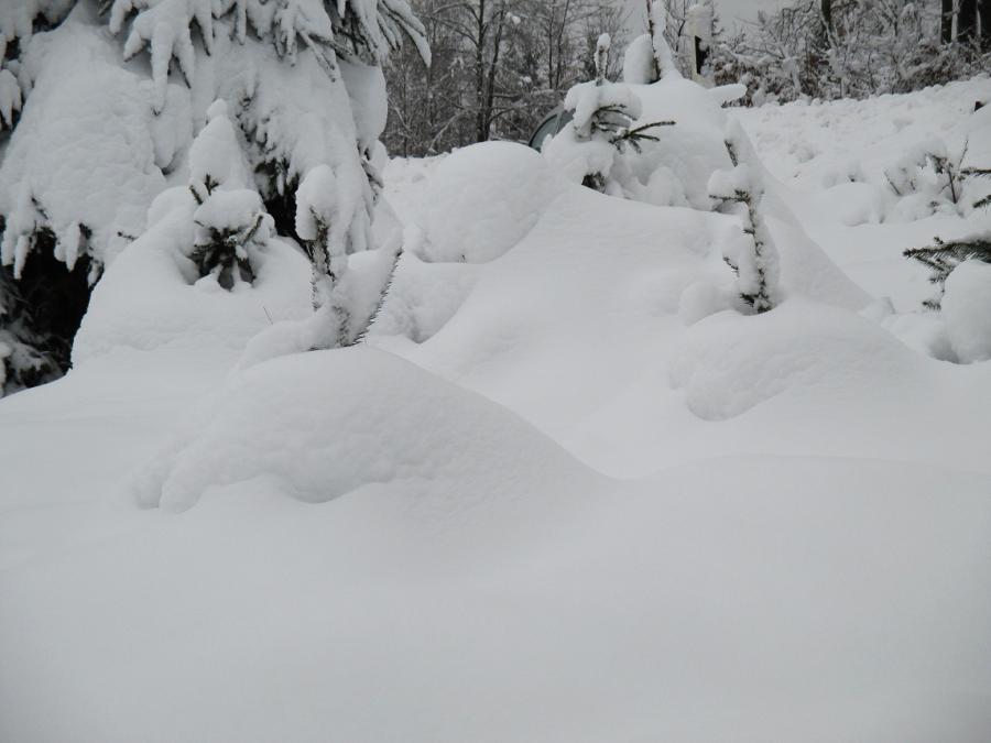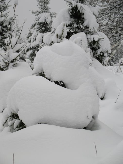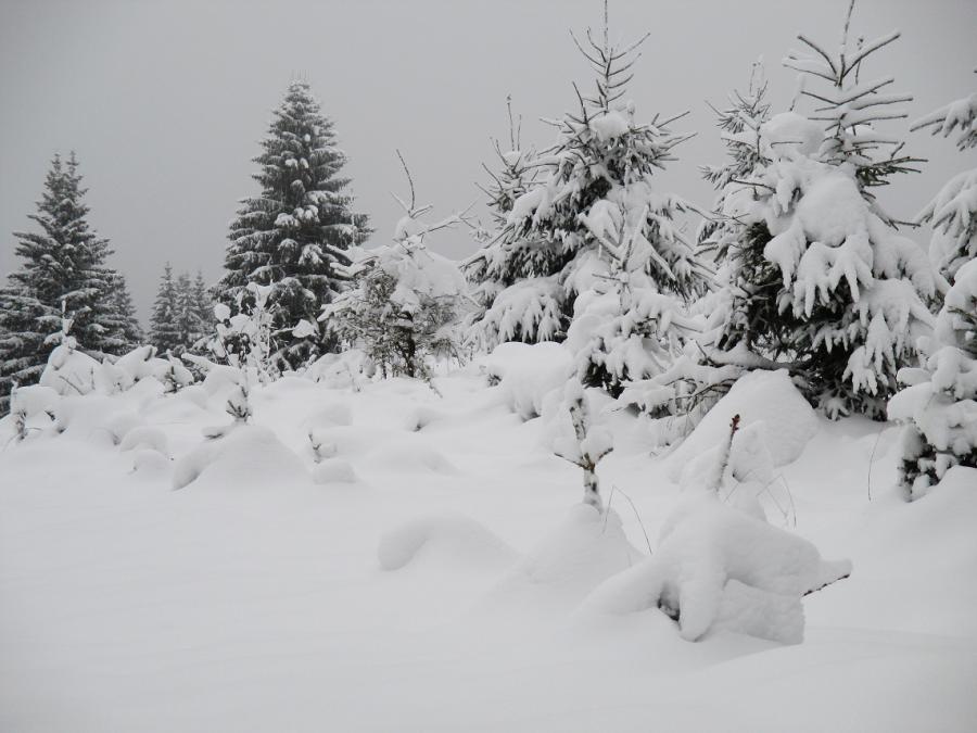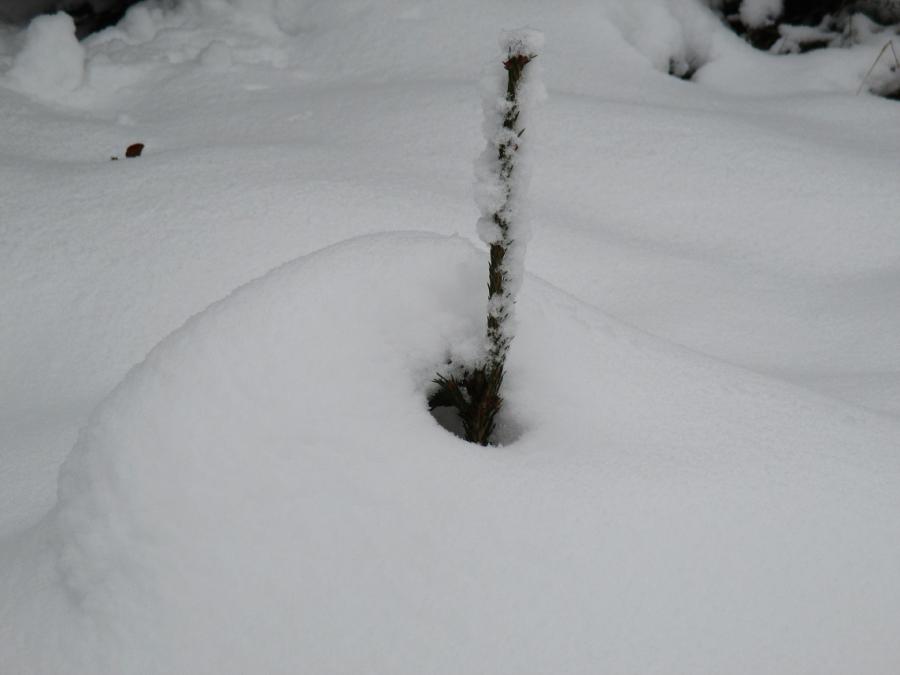 Auf der Bergwiese waren kleinere Fichten schon fast im Schnee verschwunden