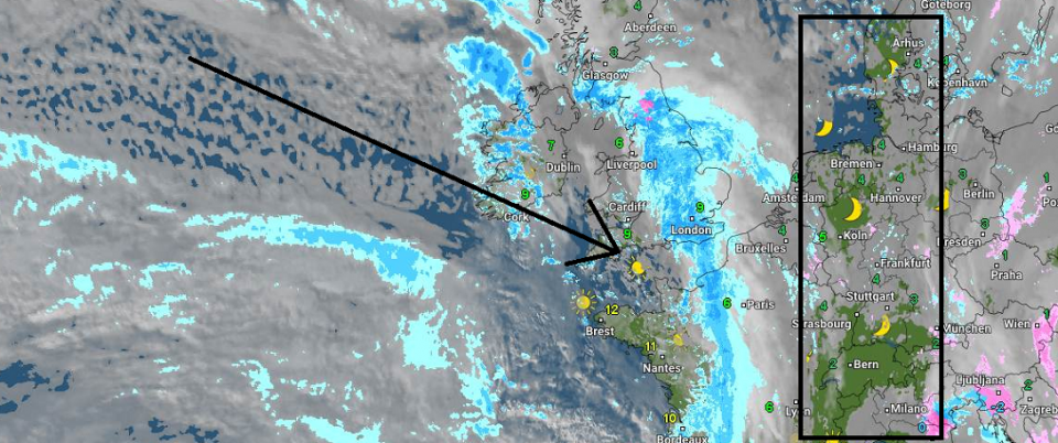 Zu der letzten Karte sei gesagt: Dieses 973er Tief ausgangs des Ärmelkanals zieht ostwärts und auf seiner Nordseite kann es Isothermieschneefall bis runter geben. Allerdings könnte es auch weiter nördlich ziehen, dann betrifft es nur ein paar Ölbohrinseln und Dänemark: