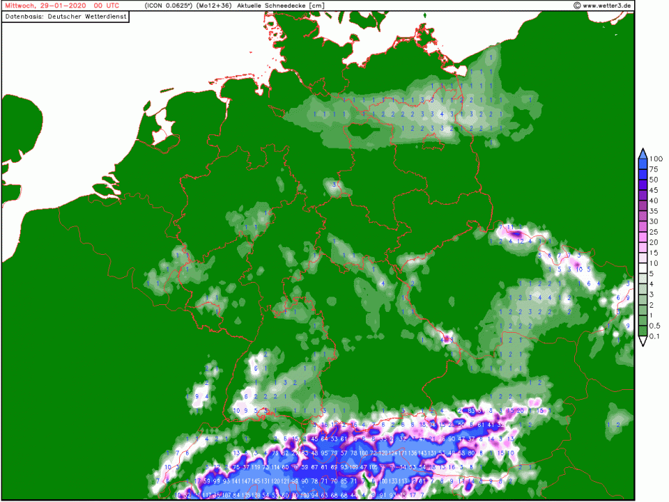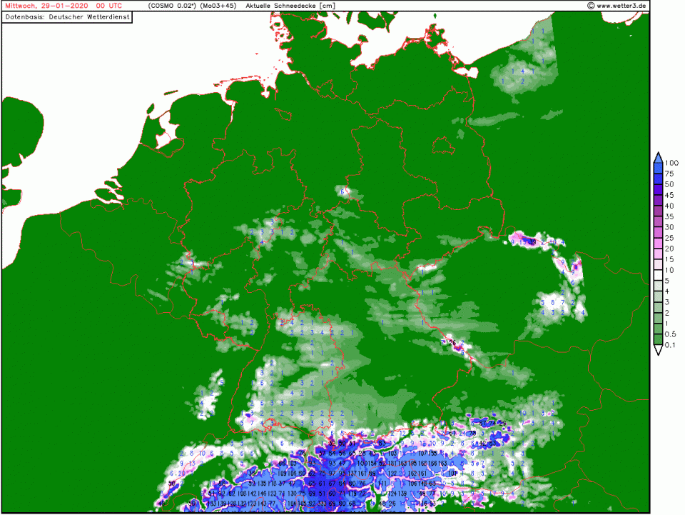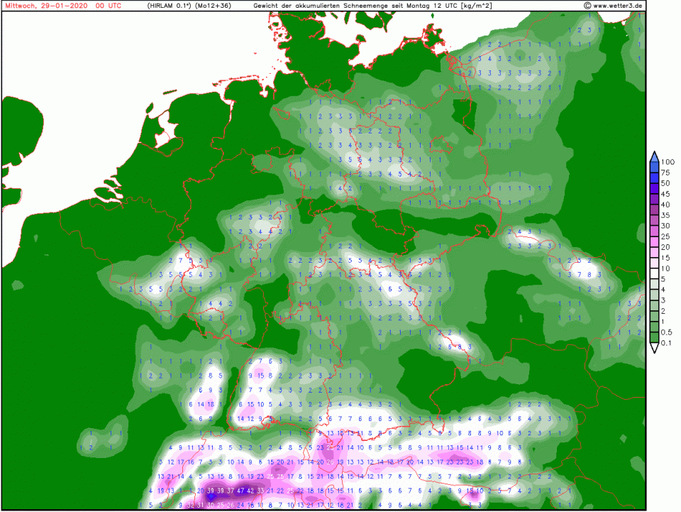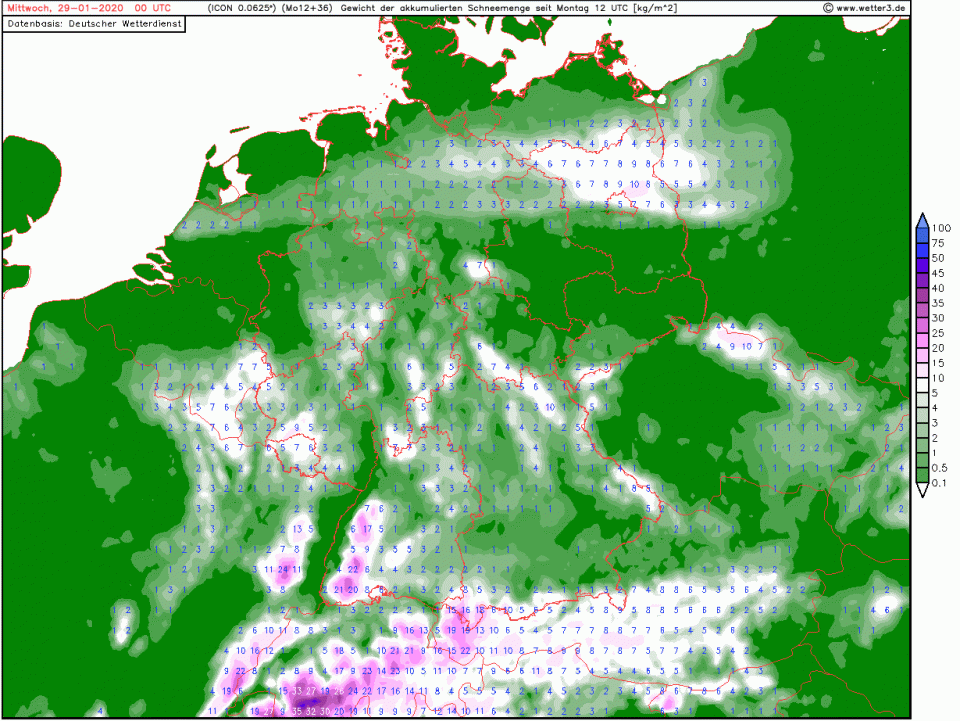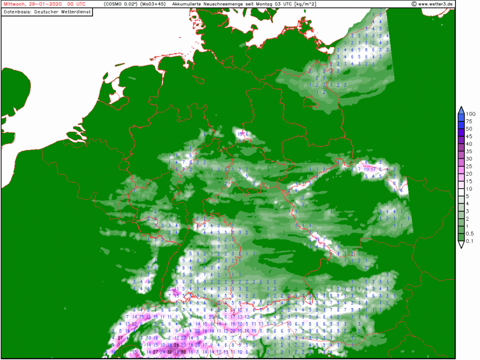 Da sollte dann doch in vielen Mittelgebirgen am Tagesende ab mittleren Lagen Schnee liegen. In den höheren Lagen sollten die Neuschneemengen auch zweistellig sein: