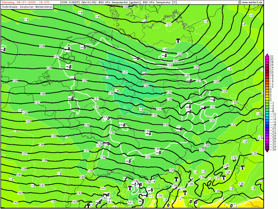 Rückseitig sinken die Temperaturen in 850hpa immerhin auf um die -5°C (also teils darunter). Und zwar dieses mal nicht in 1500m, sondern in 1200-1400m Höhe wegen des Tiefdruckeinflusses:
