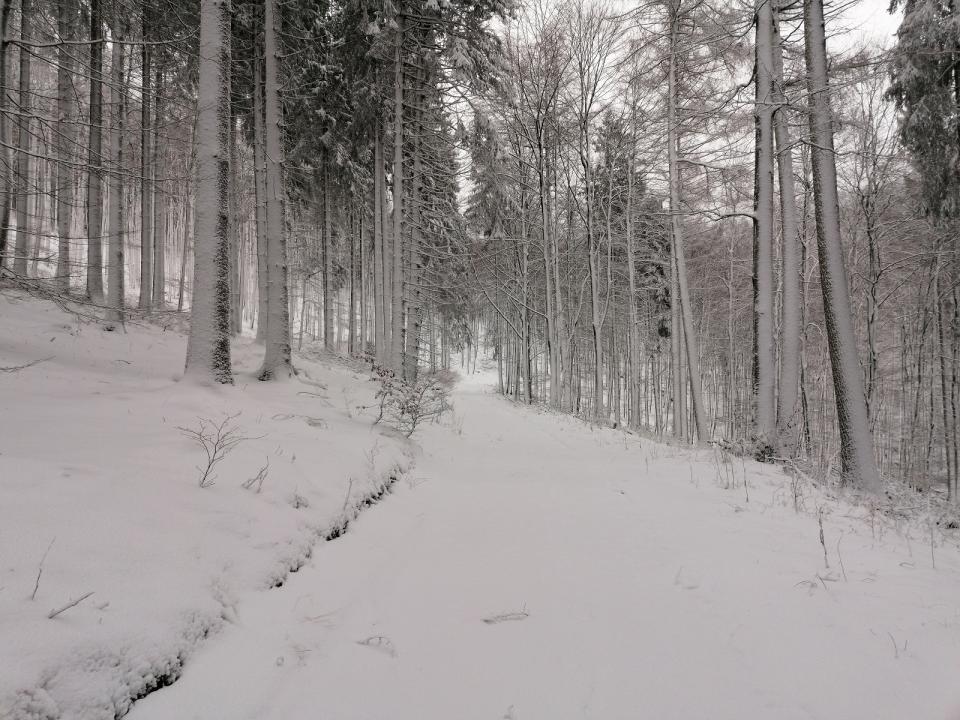 Ein Steilstück war dabei. Und gleich lag weniger Schnee auf den Bäumen, er wurde runter geweht: