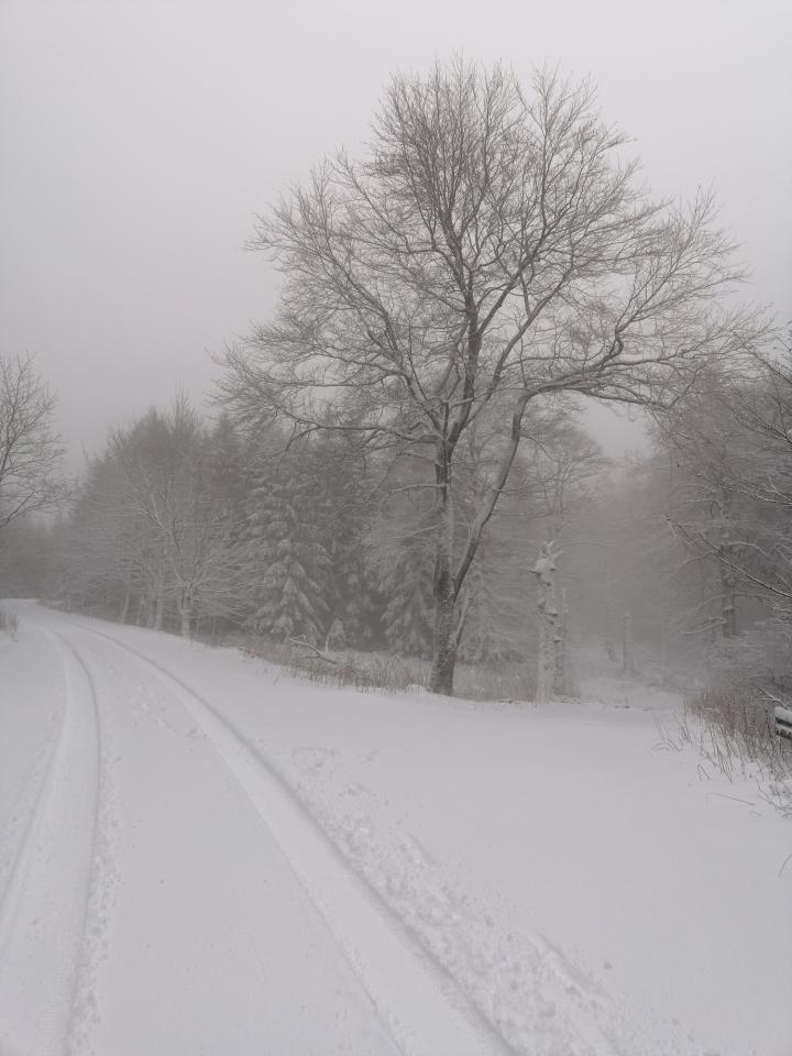 Naja, lag trotzdem noch genug Schnee auf den Bäumen:Von nun an ging's abwärts, wieder in den Bereich, wo der Schnee an allem festklebte: