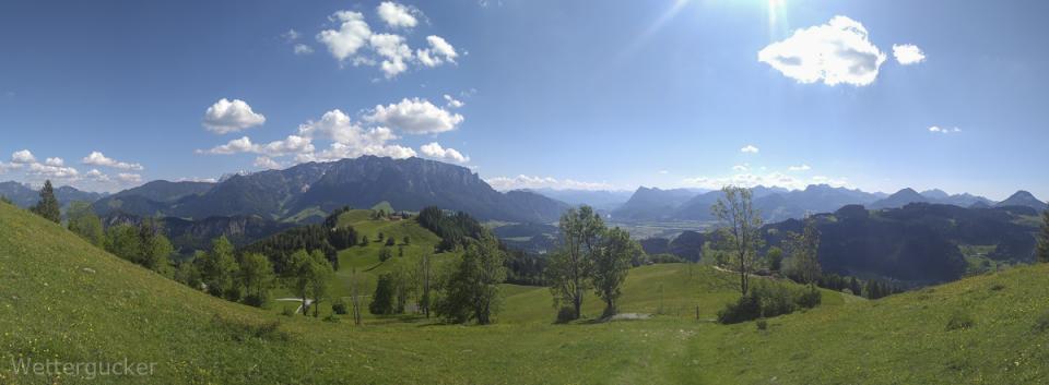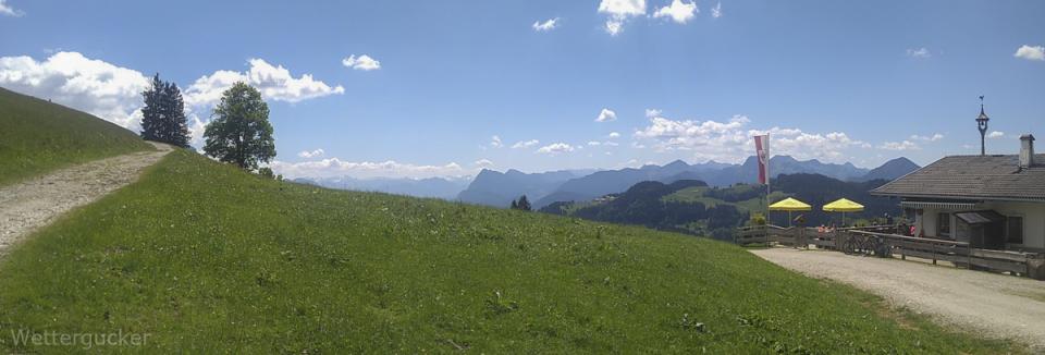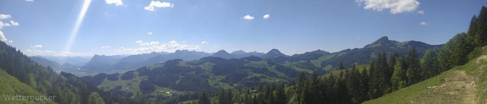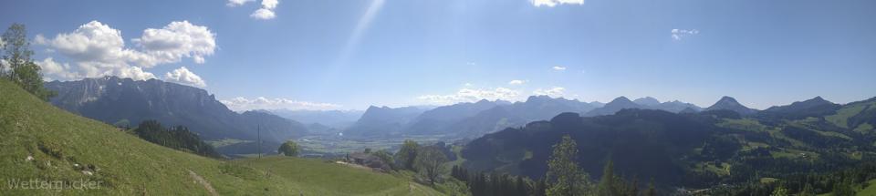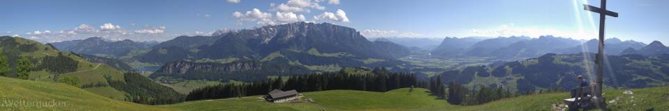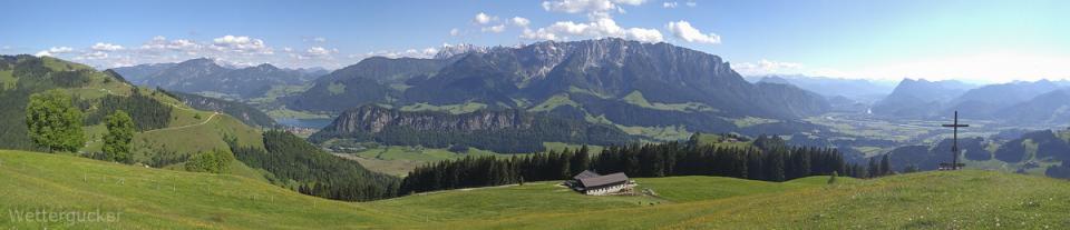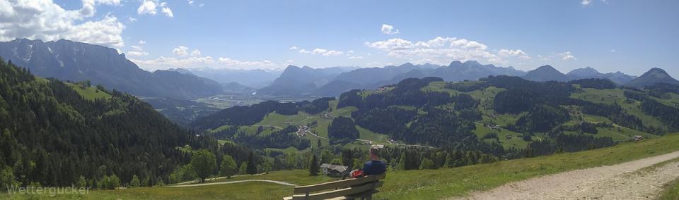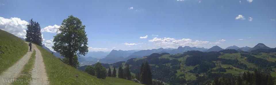 Zur Haustüre raus, eimal auf die andere Seite vom Tal -in gut 8min- gelaufen und hoch auf die Bergspitzen, welche Wettergucker-Balkonien genau gegenüberliegen. Dabei geht es auf zwei Berspitzen mit jeweils 1240 und 1241m, wobei man bei der Wanderung selber gut 550Höhemeter macht und gut 10km zurücklegt. Es dauert halt länger -zumindest für mich als Gucker- weil die Wanderung mit einer anhaltend grandiosen Aussicht mehr als überzeugt. Ab gut 1000m weiter aufwärts kann man irgendwann recht frei von Südost über Süd, Südwest bis nach West gucken. Immer im Blick das große Massiv vom Kaisergebirge. Ein Gebirge im Gebirge, der Walchsee im Kaiserwinkel, das Inntal, Kufstein, Teile der Zentralalpen, westlich der Wendelstein und und und ... ein grandioser Blick und zählt für mich zu den Highlights meiner absolut direkten Heimat. Man ist über leichte Wanderwege wie auch über schwierigere Jägersteige schnell oben. Geht man über die Forststraße, welche im Winter zu einer tollen Rodelbahn mit fantastischen Ausblick umfunktioniert wird, ist selbst ein nächtlicher Ausflug kein Thema. Hier einige Bilder dieser Wanderung. Diesmal nicht wie üblich mit der Spiegelreflex fotografiert, sondern mit dem Smartgedöns. Sollte mal ein kleiner Test sein, denn der Wettergucker konnte sich nun leider nimmer diesem Kommunikationsgeschwurbel entziehen und musste sich solch Dingens zulegen (beruflicher Grundtenor). Freunde lagen mir natürlich auch schon länger in den Ohren, wobei man bei der nun urplötzlich einsetzenden Wetterguckerschnellmachbuidlflut samt Texten schon überlegt, mir das Gerät wieder zu entziehen resp. ihn aus gewissen Verteilern (Messaging Dienste nennt sich das glaub) zu entfernen.