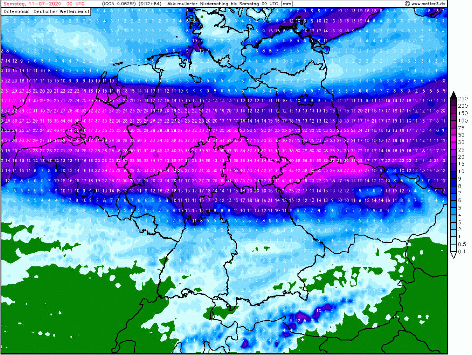 ICON 12z Hauptlauf simuliert in einem breiten Streifen über der Mitte Deutschlands über 30mm bis incl. Freitag als Landregen... also nix heftiges, wenn man den langen Zeitraum berücksichtigt. Im Norden gibt es ein paar Höhenkaltluft-Schauer, im Süden ein paar Wärme-Gewitter: