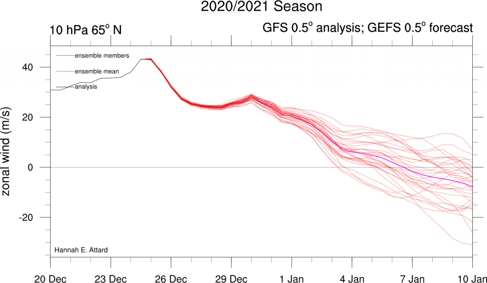 Negativer Zonalwind ist Ostwind. Das würde gepaart mit der raschen Erwärmung für die Erfüllung der Kriterien eines Major Warmings genügen können. Trotz aller Unsicherheiten der Berechnungen gehe ich selbst nun von einem Major Warming aus, vielleicht aber erst um den 10. Januar herum, also etwas später.