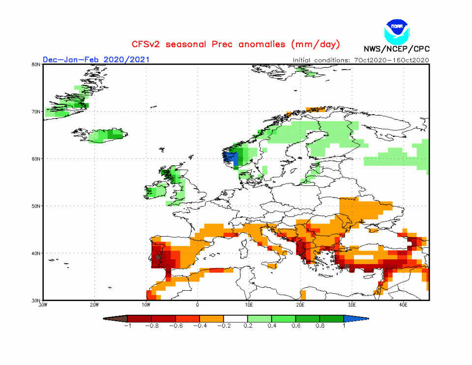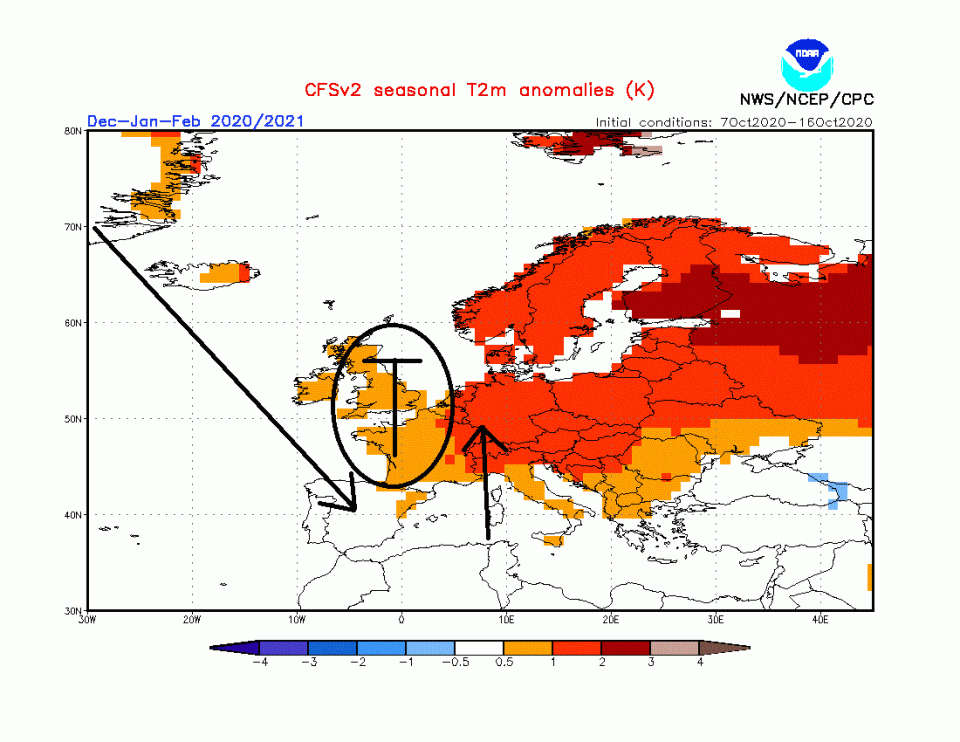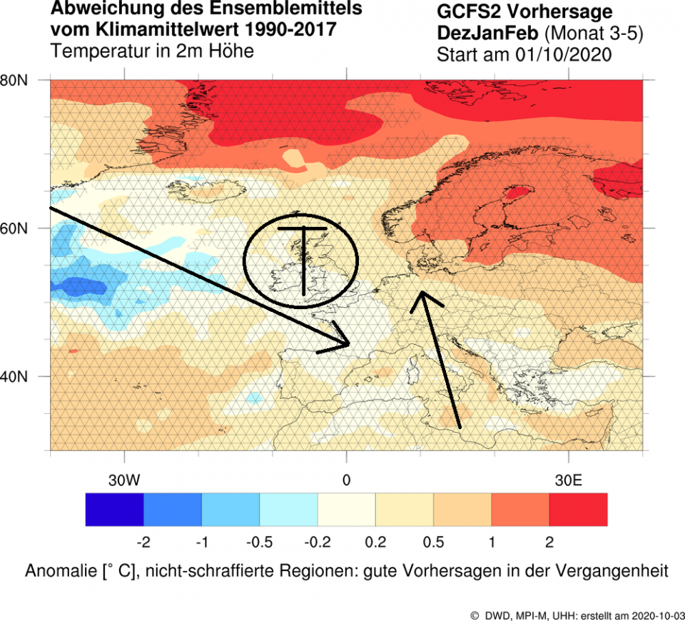 Sowohl der DWD als auch die NOAA sehen im kommenden Winter halbwegs gemäßigte Temperaturen in Westeuropa vor, Mitteleuropa auf der warmen Vorderseite: