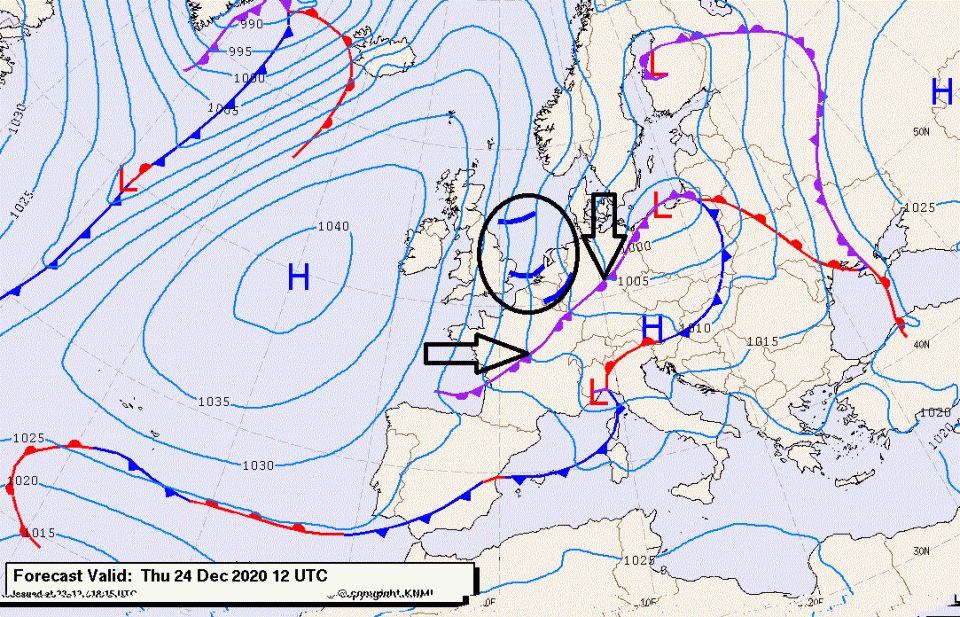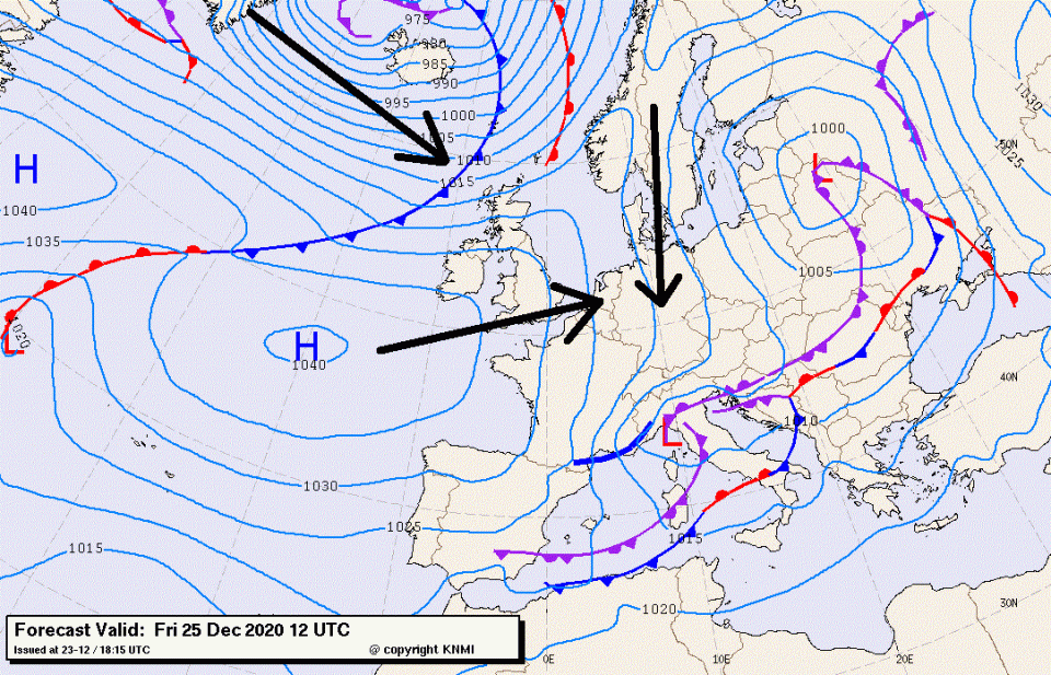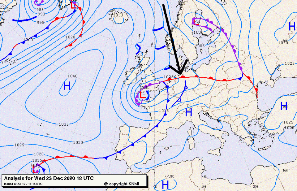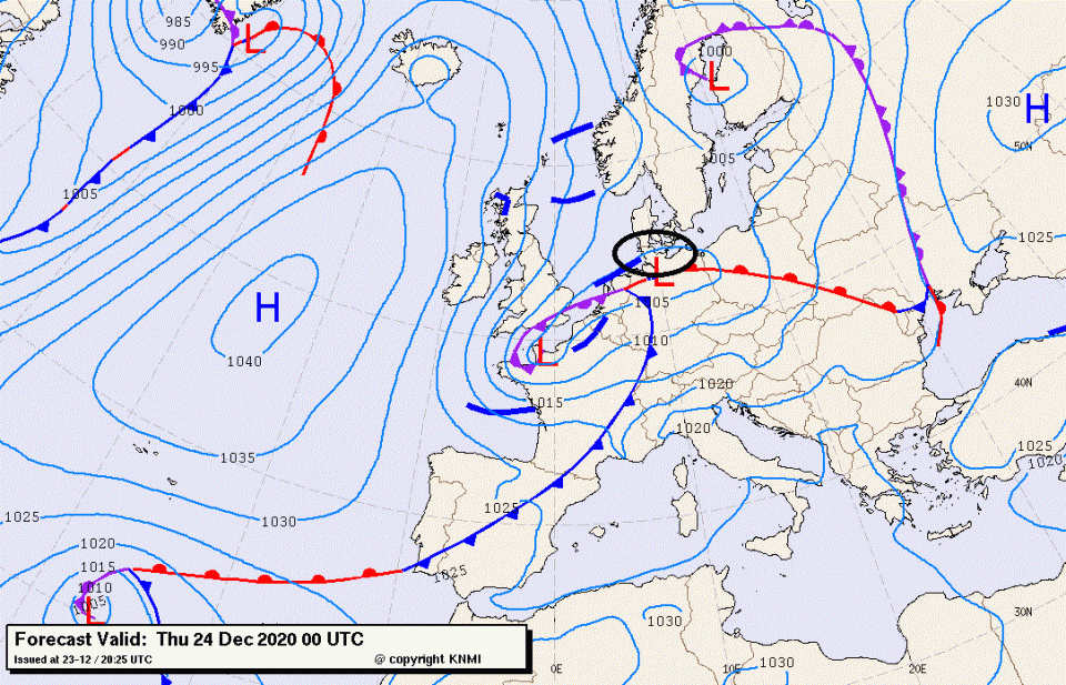 Eigentlich schade, die Kaltluft im Norden ist nicht ganz kalt genug. Immerhin entstehen durch die nordwärts vorankommende Warmluft Aufgleitniederschläge. Ein bisschen kälter, und das norddeutsche Tiefland hätte weiße Weihnachten. Naja, vielleicht gibt's trotzdem noch irgendwo nasse Schneeflocken bei 1-3°C: