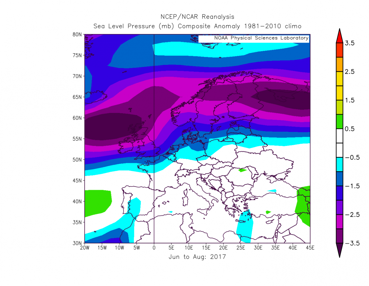 Hintergrund: Sommer 2017, der bis dato letzte richtig ausgeprägte Westlagen-Sommer, siehe Bodendruck-Anomalien zum Mittel 81-10. Okay, in Süddeutschland antizyklonal West, das war dann auch schon ziemlich warm bis heiß: