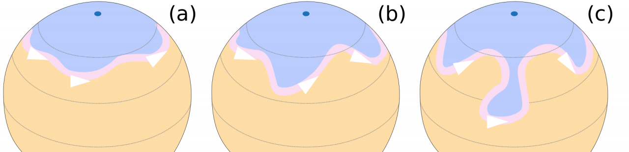 Dieser zunehmende (Höhen-)Hochdruck will irgendwo hin. Das äußert sich in häufigeren Blocking-Wetterlagen, sowohl in die kalte, wie auch in die warme Richtung. Bildlich veranschaulicht: Die Tröge und Höhenhochs nehmen immer mehr die Form © an, wo sie vorher (a) waren.
