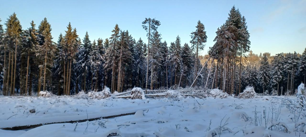 Der Borkenkäfer greift gerne am Rande von Windwurf-Flächen von Stürmen an. Man vergleiche linke Bildhafte im Vordergrund gegen die kleinen Bäumchen im Hintergrund und die großen Bäume drum herum: