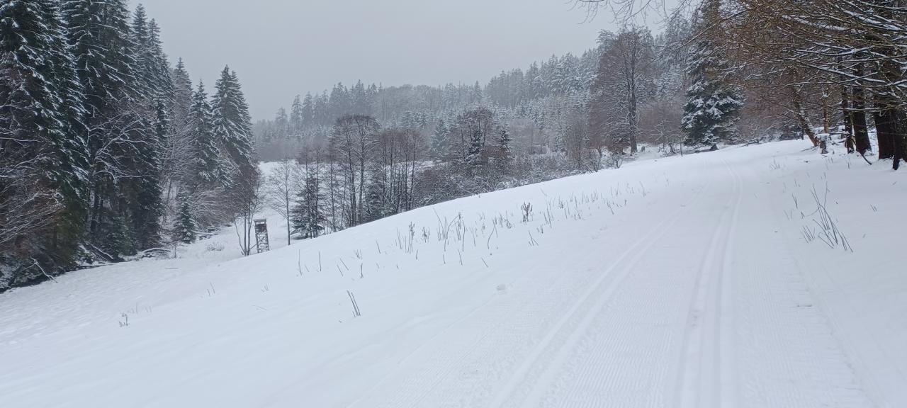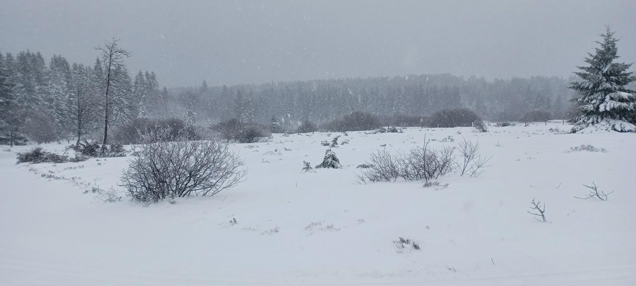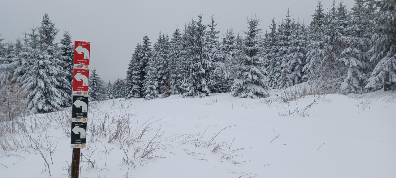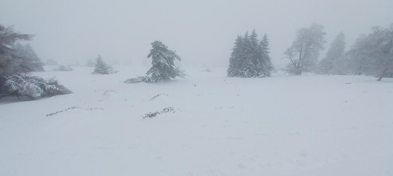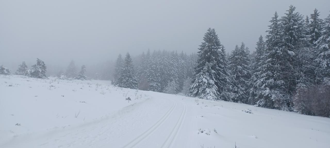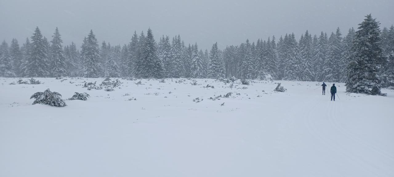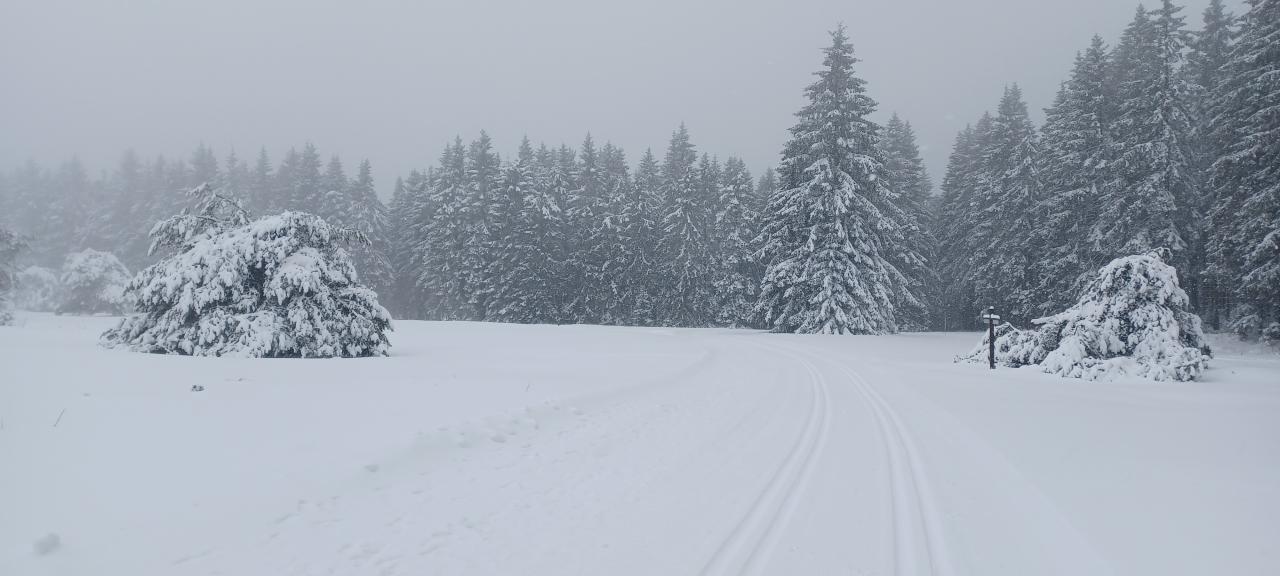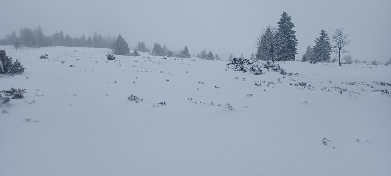 Und die letzte halbe Stunde wurde es sogar ziemlich vollwinterlich, denn zu den ca 30-40cm auf 770-800m gesellte sich noch recht kräftiger Schneefall... naja, was man so "fall" nennt. Bei dem kräftigen Wind fiel der nicht wirklich.