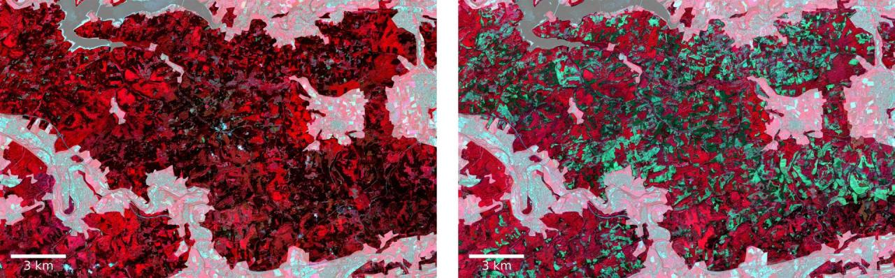 Der Blick aus dem All zeigt, dass überwiegend die Mitte Deutschlands mit ihren Nadelwäldern betroffen ist – von der Eifel, über Sauerland, Harz und Thüringer Wald, bis in die Sächsische Schweiz. Allein Nordrhein-Westfalen verlor innerhalb von drei Jahren mehr als ein Viertel seiner Fichtenwälder, in einigen Landkreisen waren es sogar mehr als zwei Drittel. Die Bäume starben ab oder fielen großflächigen Notfällungen zum Opfer.