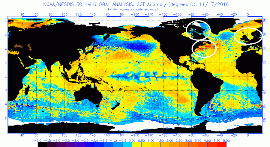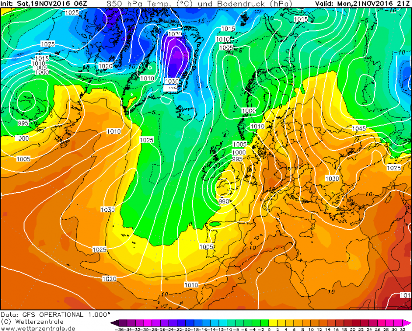 Tief vor der Ami-Ostküste lenkt Warmluft nach Neufundland und die Labradorsee, blockierendes Azorenhoch aber sooo westlich, dass der Nordmeertrog noch zu westlich für uns gerät und wir Afrikaluft abkriegen: