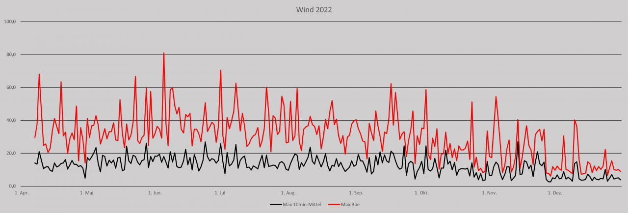 2022 war stellenweise sehr warm und zu trocken. Der Sommer war als niederschlagsreichste Jahreszeit, eher trocken, vor allem in der zweiten Hälfte. Winter und Frühling waren, so ist es anderen Stationen zu entnehmen, ebenfalls eher trocken. Seit Messbeginn am 07.04.2022 wurden 750,6mm gemessen, alleine in dem Zeitraum sind etwas über 900mm normal. Das Luftdruckmittel von 1018,9hPa spricht auch für eine Hochdruckdominanz über das Jahr hinweg.