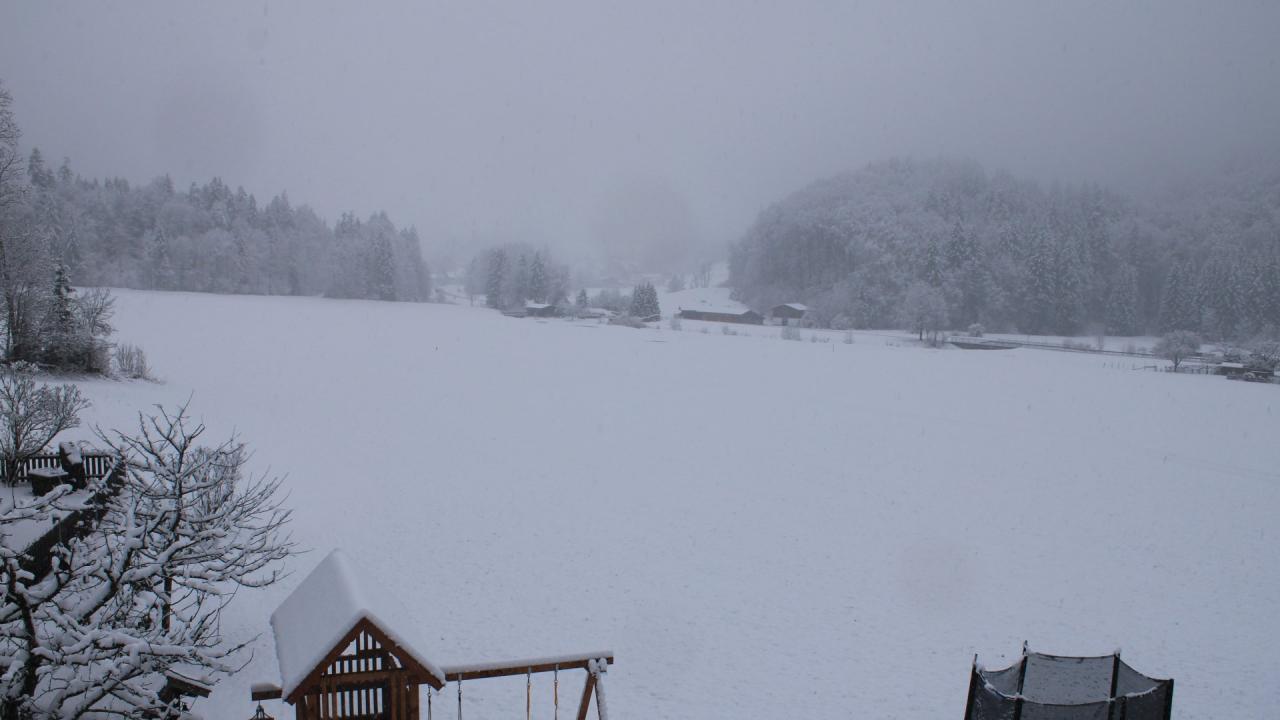 Takt 1,4°C, wechselnd Bewölkt. Bis zum frühen Nachmittag gab es noch Schneefall, der war bei leichten Plusgraden aber nicht mehr effektiv. Heute morgen lagen auf den Wiesen bis zu 10cm, sonst alles von 2-6cm. Ab dem Vormittag dann auch zunehmender Nordföhn samt Schneeverwehungen. Sehr winterliche Szenen waren das, für mich als Niederrheiner kaum zu glauben das schon Mitte April ist.