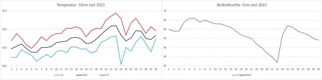 In den ersten 11 Tagen fielen schon 34 der insgesamt 49mm. Danach gab es bis auf einzelne Tage mit 0,1-2,5mm nur noch am 23.06, mit dem morgentlichem Gewitter, 10,3mm. Das ist für das Pfitschertal deutlich zu wenig. Das Soll liegt bei rund 123mm, also sind nur 40% des Solls gefallen. Das hat sich auch im Laufe des Monats bemerkbar gemacht. Die Wiesen sind vor allem nach dem abmähen braun geworden, selbst hier oben im Hochtal. Der Feuchtevorrat vom nassen Mai ist mittlerweile fast verbraucht.