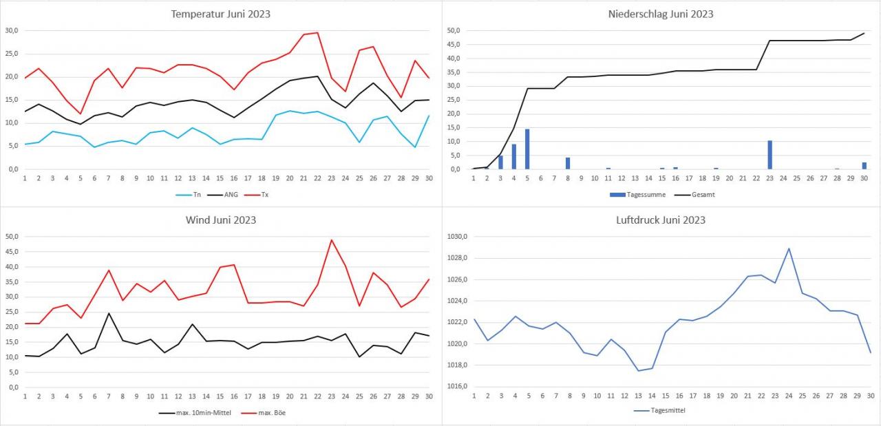 Der Juni war zu warm und zu trocken. Mit 21,2°C mittlere Höchsttemperatur war der Monat vor allem in der 2. Hälfte sehr warm. Insgesamt gab es dabei auch 5 Sommertage und die 30°C sind nur um 0,4K verpasst worden, was für 1440m verdammt warm ist (absoluter Temperaturrekord der nahegelegenen Station St Jakob ist 30,1°C).