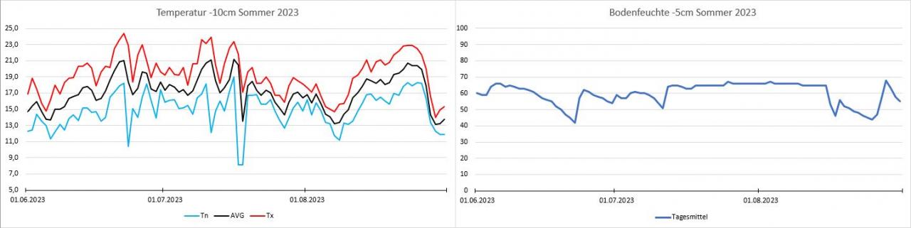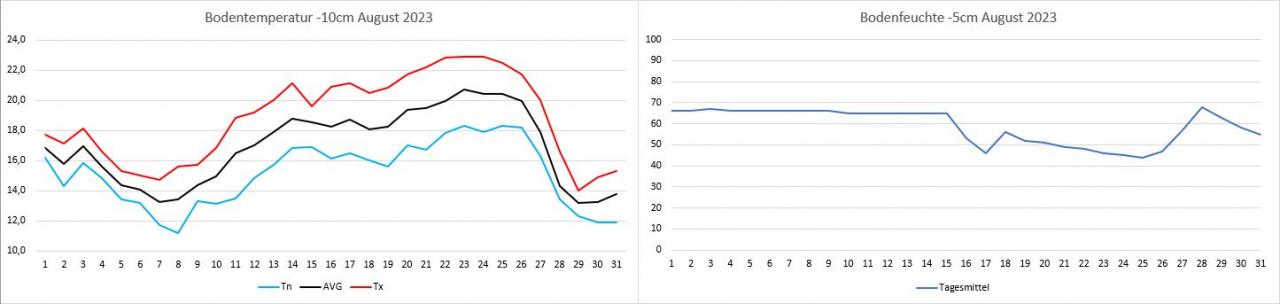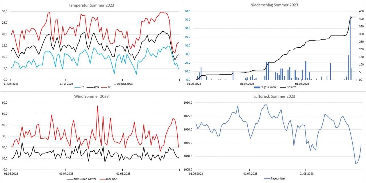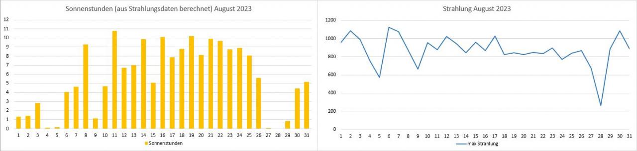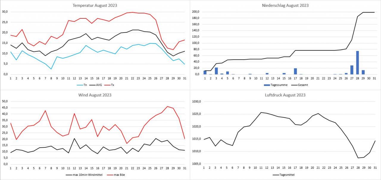 Beendet wurde die Hitze durch ein Genuatief, das neben einer deutlichen Abkühlung mit hohen Regenmengen einherkam. Der bisherige Tagesrekord der Tagessumme ist deutlich gebrochen worden (vorher 44,3mm neu 74,6mm). So war der Monat August mit knapp unter 100mm bis zu diesem Tief ab dem 27.August zu trocken (bis zum 26.08 nur 60% vom Soll), um dann innerhalb von 48h das Soll deutlich zu überschreiten.